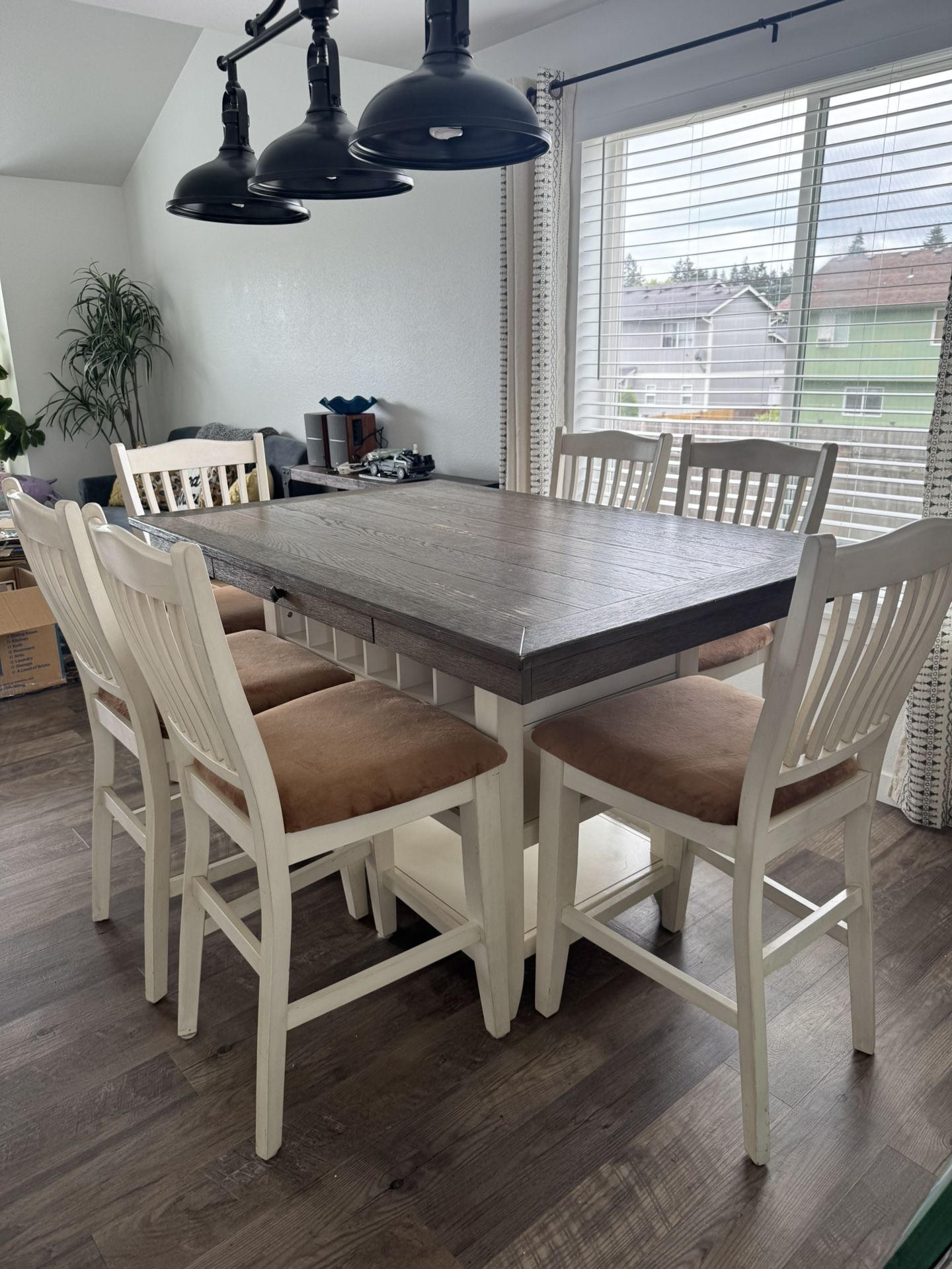 Super cute dining room table with 6 chairs, 2 drawers and lots of storage underneath. A few of the chairs need to be screwed down again. Comes with chair covers (pictured). Measurements: 60” long x 39.5” wide X 36” tall