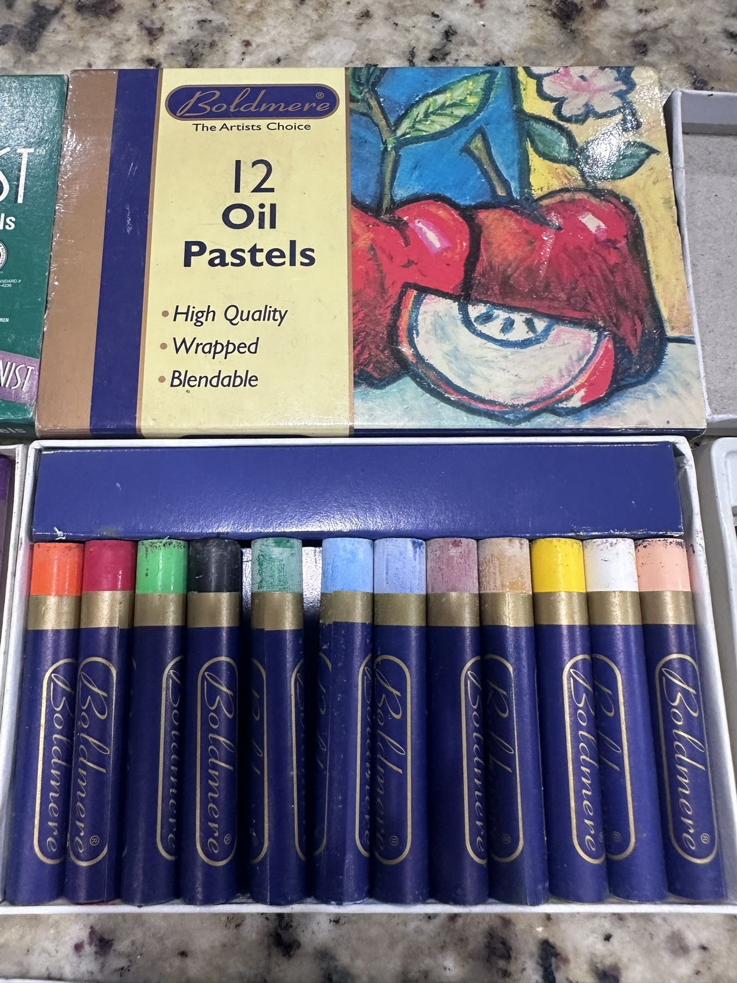 Several boxes of oil pastels, putty rubber and blending stumps.