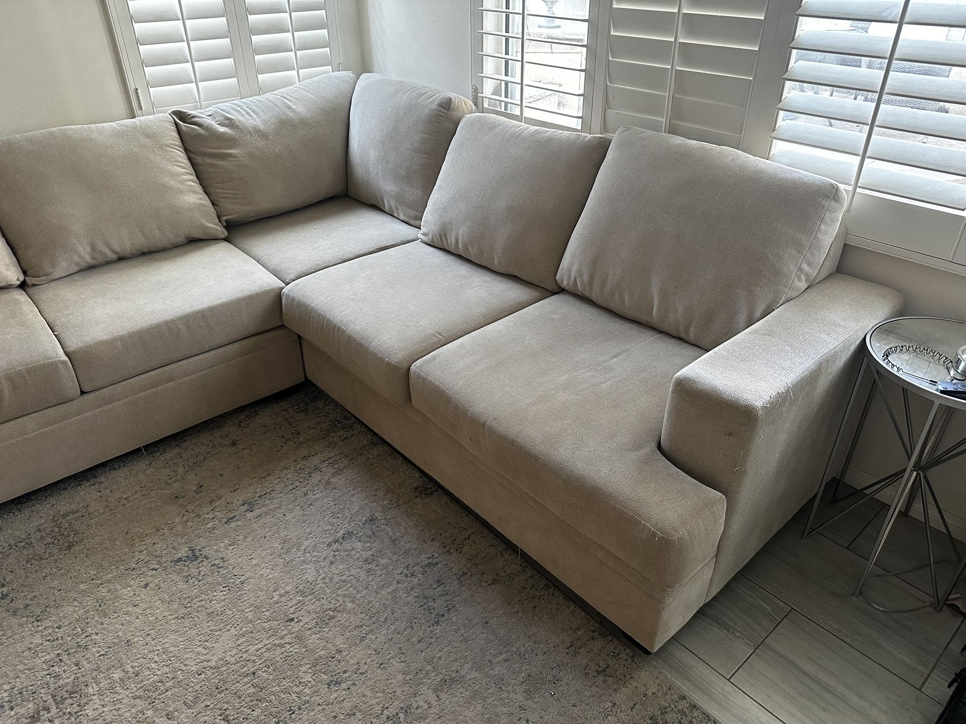 Large beige L shaped sofa. Some damage from pets pictured, one cushion is damaged but just needs the zipper fixed/replaced Price negotiable