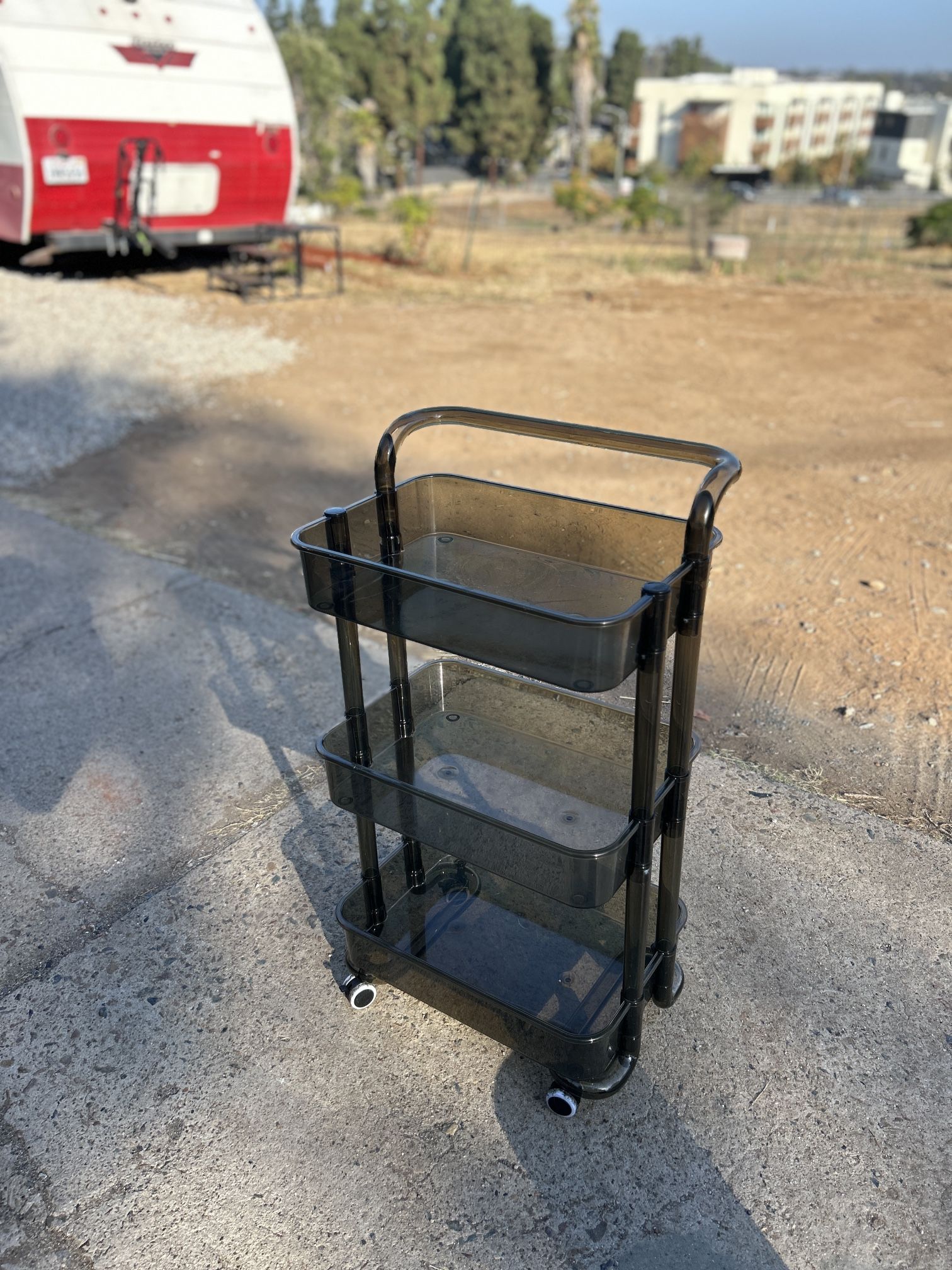 Forest green organizing rack with wheels. Last photo shows it broken down for storage!