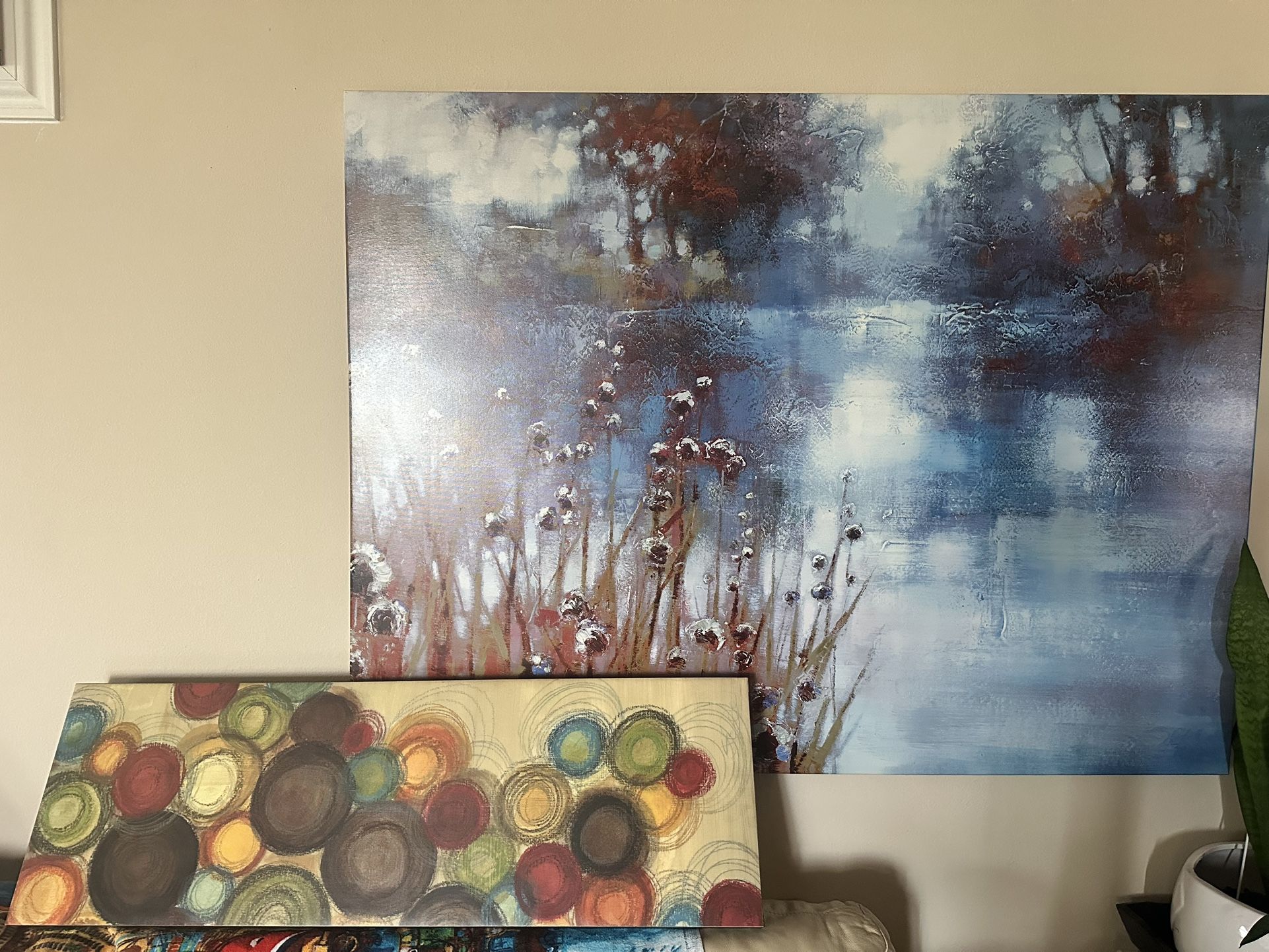 Set of two paintings: abstract circles and landscape scene. 3’x4’ and 2’x3’ This is the Crestview Collection Bettendorf Wall Art, also known as Beckendorf Wall Art. This hand-finished canvas painting depicts a serene pond surrounded by trees and flowers. It features vibrant colors, including yellow, blue, green, and orange. The artwork is stretched over a wooden frame and comes ready to hang. The painting can be found at furniture and home decor retailers.