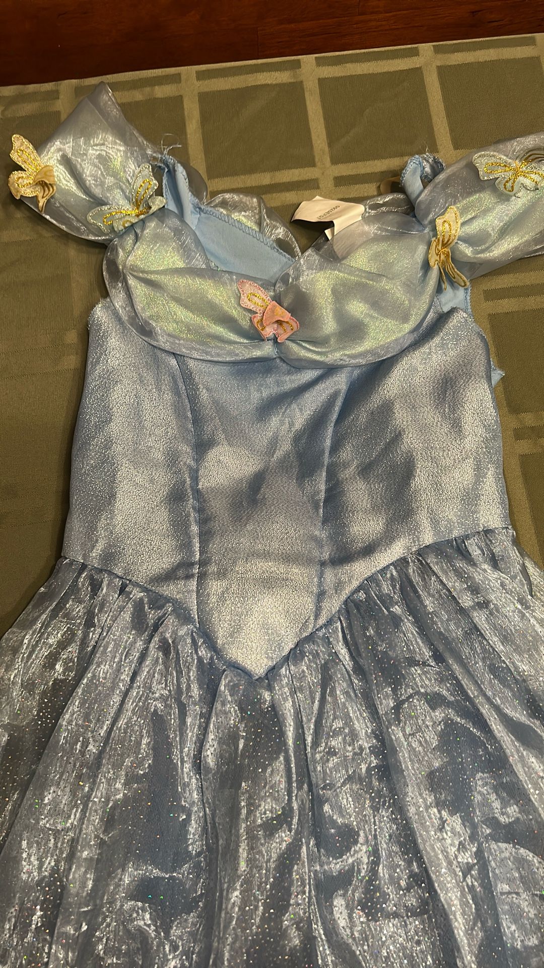 Only dress available Disney Cinderella dress costume Full length , glitter overlay, butterfly accent, tulle, velcro fastened Size small 4-6x No rips, tears or stains Only$8!