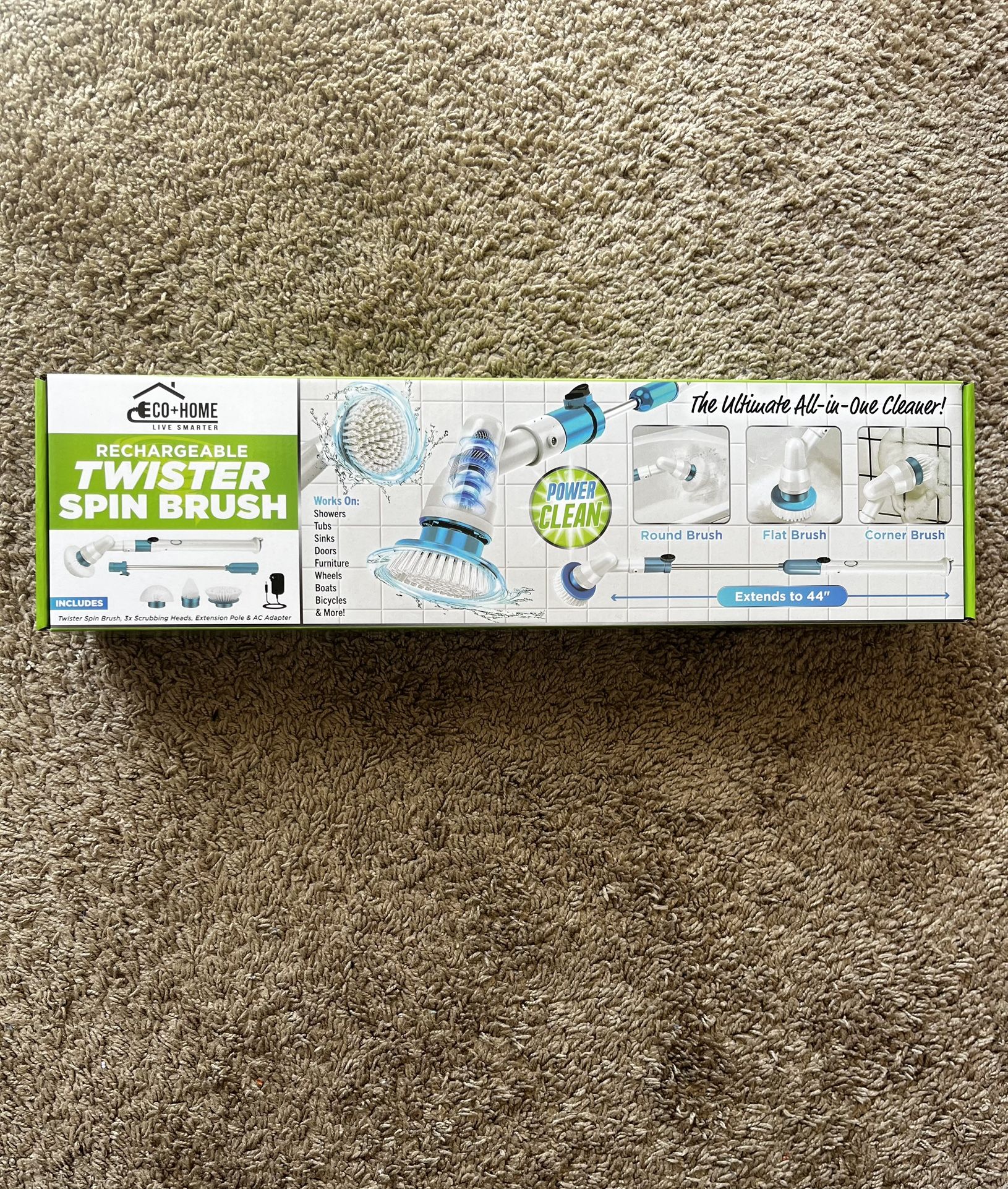 Rechargeable twister spin brush. New and unopened. Includes 3 scrubbing heads, extension pole, and AC adapter.