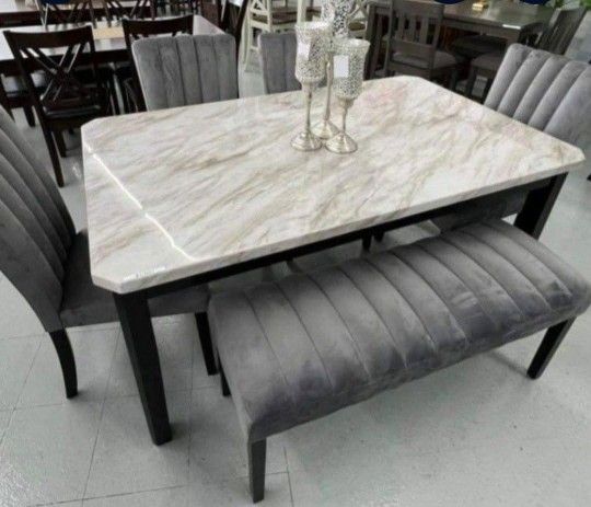 5 pc Pascal black wood finish faux marble top dining table set grey fabric. This set includes the table and 4 - side chairs . Table measures 38" x 64" x 30" H. Side chairs measure 20" x 20" x 38" H. ✅️✅️ bench not included ($454 + sale tax $499 ) This promotion is just pick up ✅️ only delivery is not available ✅️ ✅️