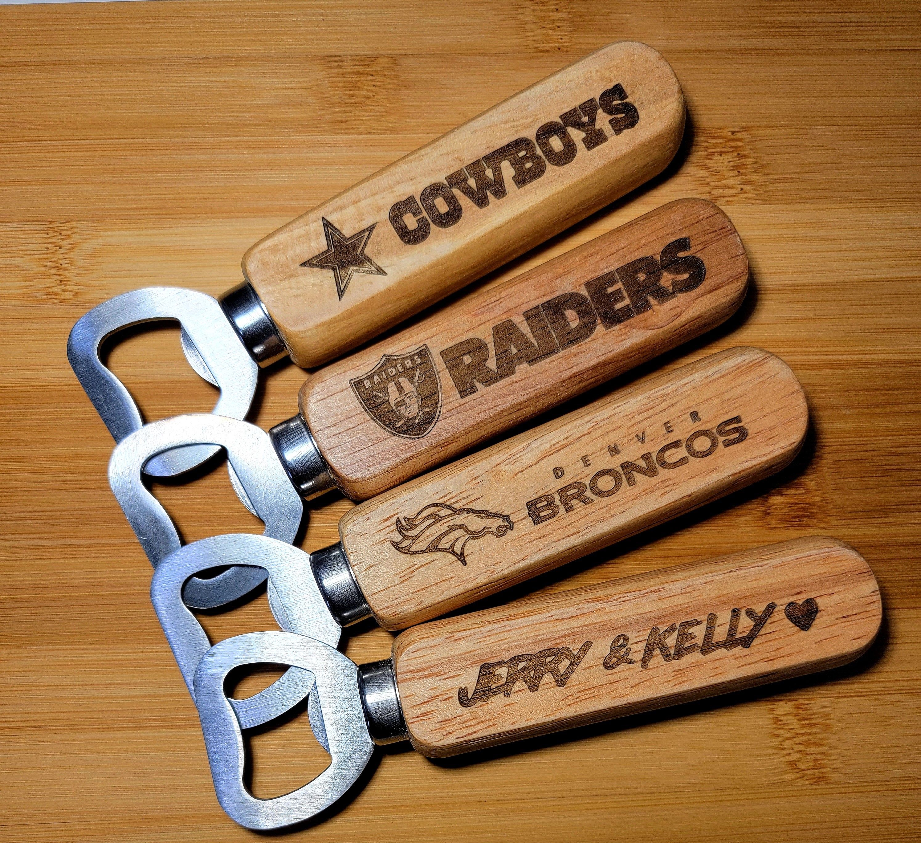 ***All our items ship from BAKERSFIELD,CA. Local Pick-up in BAKERSFIELD,CA ONLY.*** THIS LISTING IS FOR A SET OF TWO OPENERS. Minimum order quantity Give the best gift! Wood handle bottle opener personalized with whatever message you want that fits. *This listing is for 2 OPENERS. WE SELL THE CUTTING BOARDS FOR $ 30 EACH For volume discount just ask! Details: Measures 4.5x2 inches Metal opener very sturdy Wood handle Just let us know what you'd like! Price is for one side only. For 2 sides, it's an extra $5 --I process all the orders on weekends. Shipping every Monday Volume pricing available.