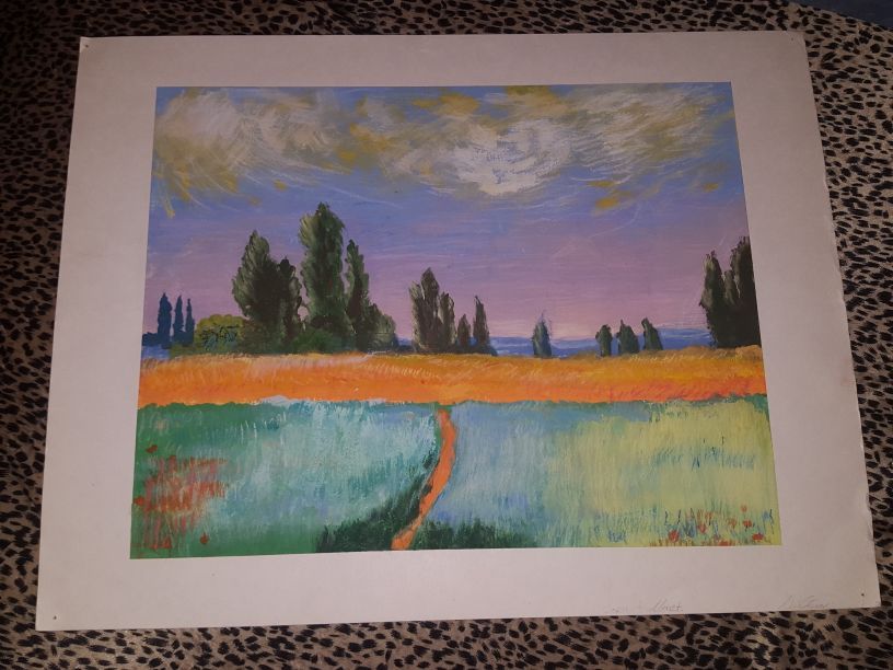 A self done acrylic painting with pastel highlights- illustration was done as a copy of a Monet painting 14"x11". (my boyfriend is the artist of this painting).
