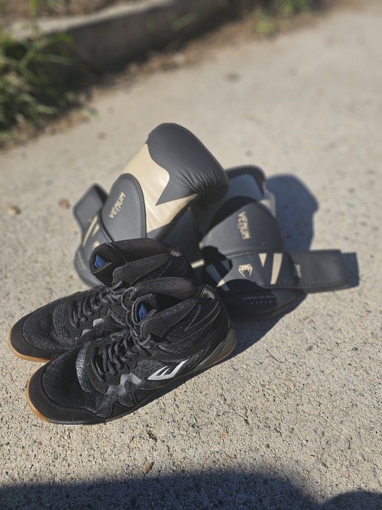 (Venum) These are really good for muay Thai These will last a long time along with the they're made with high quality durable synthetic Leather, they're Mexican style glove in terms of padding so if you have sensitive knuckles These are perfect for conditioning and are really good for getting feedback from your punches and comes with built in splint system for a secure wrist they're honestly my favorite gloves rn but I just wanna save up for a really fancy pair of gloves (Everlast pivot) awesome shoes for any level beginners, intermediate, and pro These along with the everlast elites are the best shoes on the market with a collaboration with michellen man sorry if I butchered the name but traction with these shoes is no issue cubano, soviet style, drunken master anything with a lot of footwork you will be happy brand new shoes literally worn twice (SELLING BOTH TOGETHER FOR 100$) (And dont worry I will wipe them down the gloves got some dust and the shoes too I dont use them much) ALSO THESE SAY SIZE TWELVE BUT THEY RUN VERRRRY SNUG IF YOURE A SIZE 10-12 YOULL BE FINE MAYBE EVEN 9.5US)