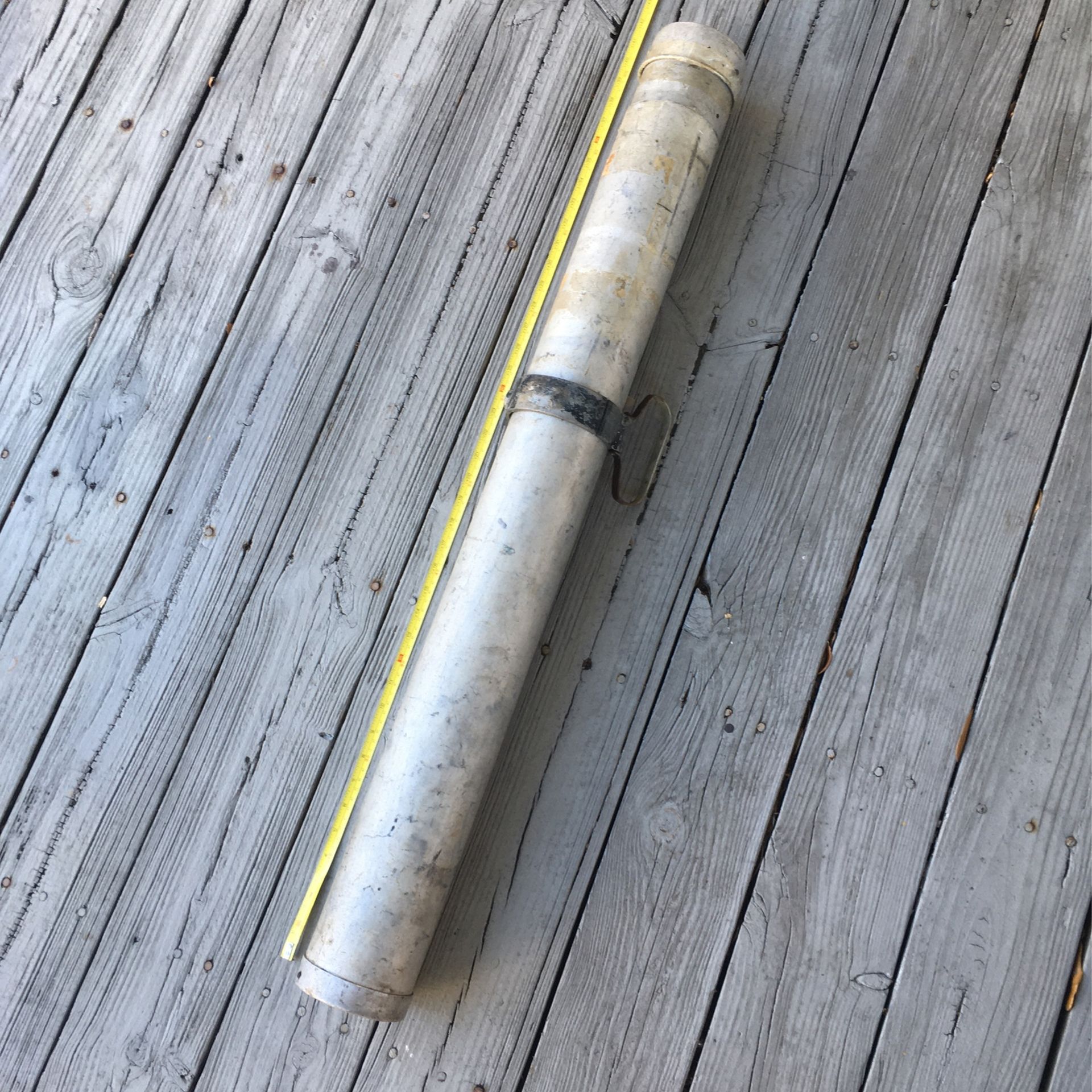 Metal tube with cover 40” long Diameter 4” Use for drawings or art My husband used it for fishing rods that could come apart and they stayed safe inside of the metal tube when we were traveling. The strap holding handle on is cracked- see photo.