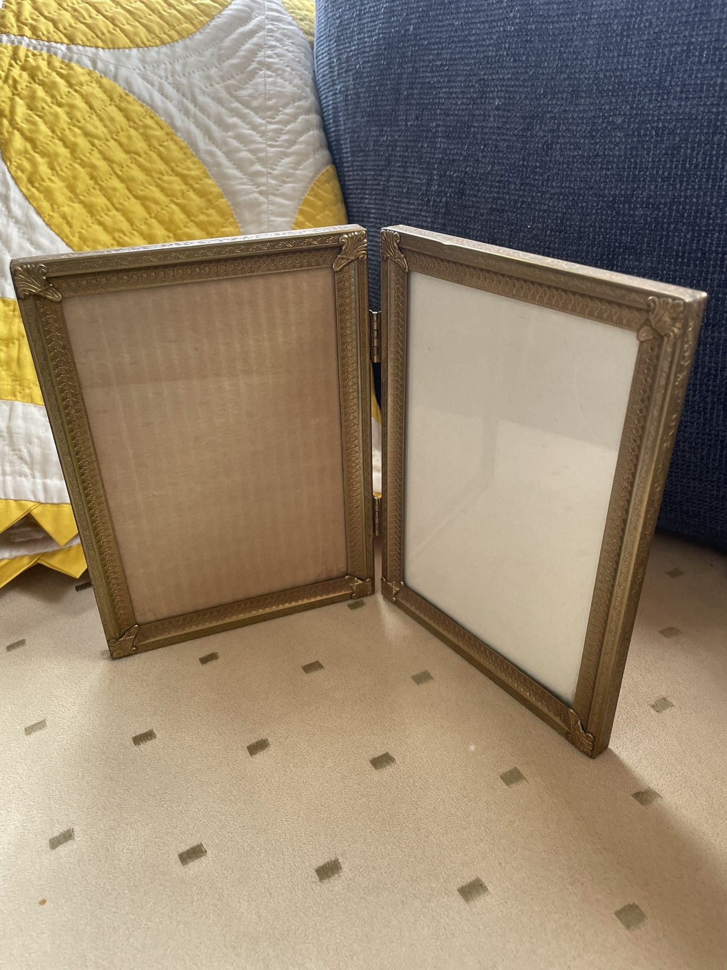 Vintage gold tone 5 x 7 hinge picture frame. Glasses is good on both frames.