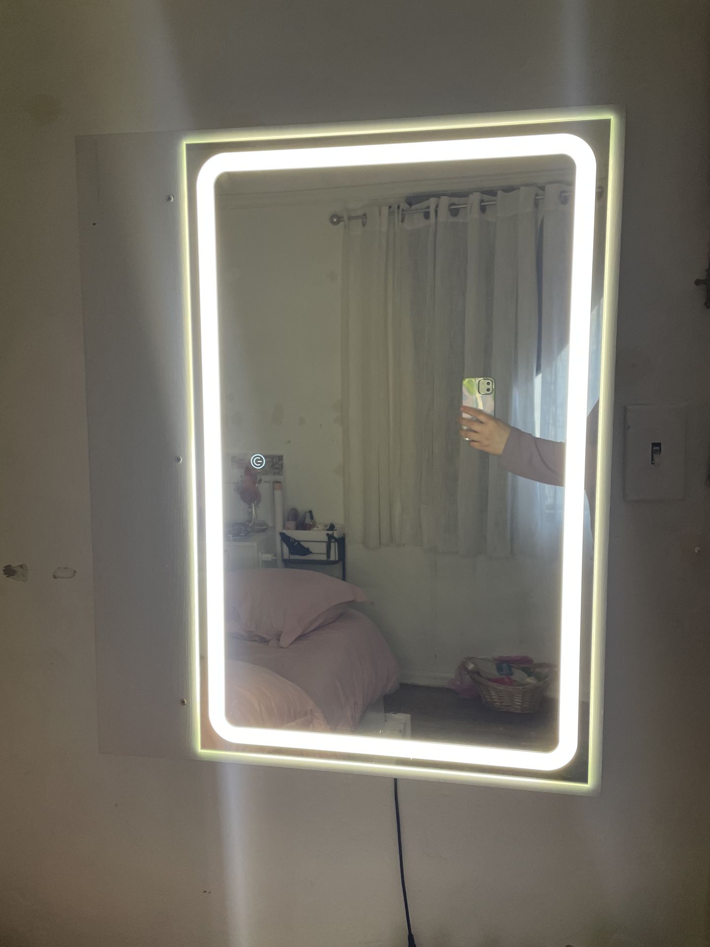 White Vanity Mirror, in good use. Has 3 LED settings 25x31inch Bought two years ago and no need for it now. Has 3 holes on the side if you would want to holster it up to a wall. Does not have hook attachments on the back.