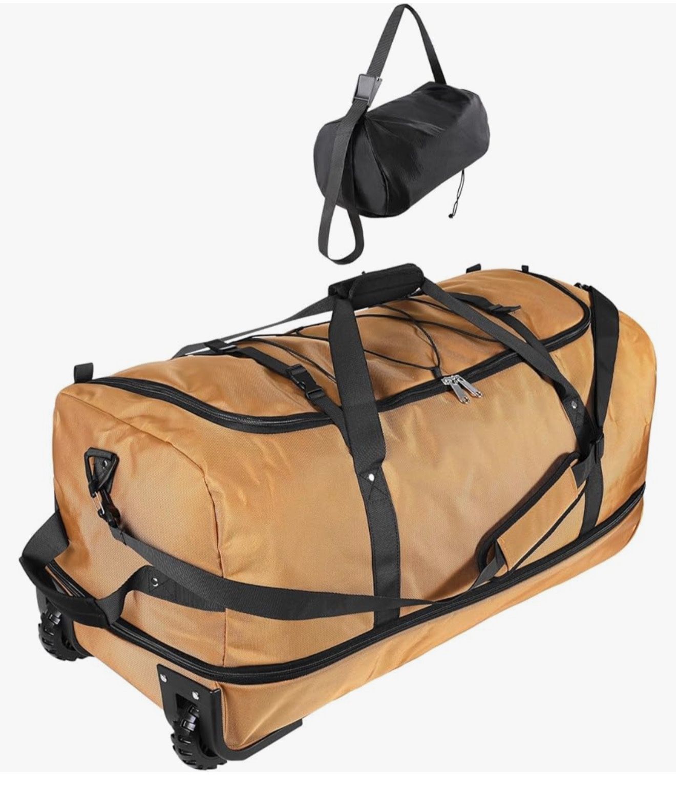 New in Package. Retail at $80. [DIMENSIONS]: 31.5" L × 14.2" H × 15" W (110L) Standard,31.5" L × 14.2" H × 19" W (143L) Expanded. [MULTI-FUNCTIONAL POCKETS]:Features a padded PP board divider with 3 pockets and 9 rods/loops for quick assembly and removal. [COMPRESSION & SECURITY]: Adjustable compression straps and a bungee-cord system to keep contents secure; Includes a detachable shoulder strap for cross-body carrying. [DURABLE CONSTRUCTION]: Waterproof PVC-laminated Oxford fabric; Enhanced tear resistance; Thick quilted base prevents sagging for shape retention;Double-track anti-burst zipper prevents splitting even when holding heavy-weight goods. [NO-TELESCOPE-HANDLE ADVANTAGE]:Lightweight, handle-free design with compression straps and a bungee system for stability.