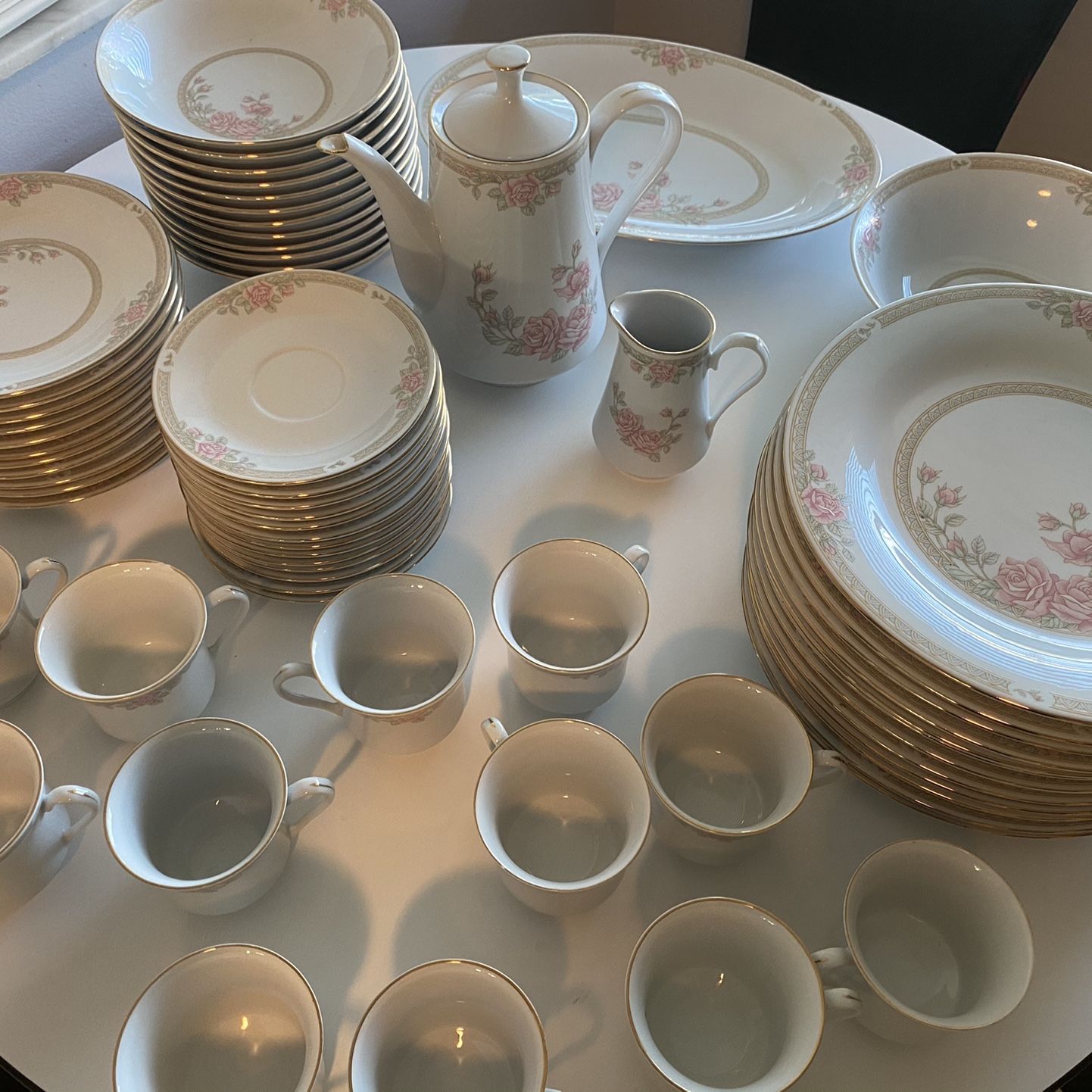 Fine China set- amazing set!! Priced to sell!!! 12 dinner plates 11 salad plates 13 teacup saucers 12 teacups- one has small chip in gold rim 12 salad bowls 1 serving bowl- has slight chip in gold rim 1 serving plate 1 teapot 1 creamer