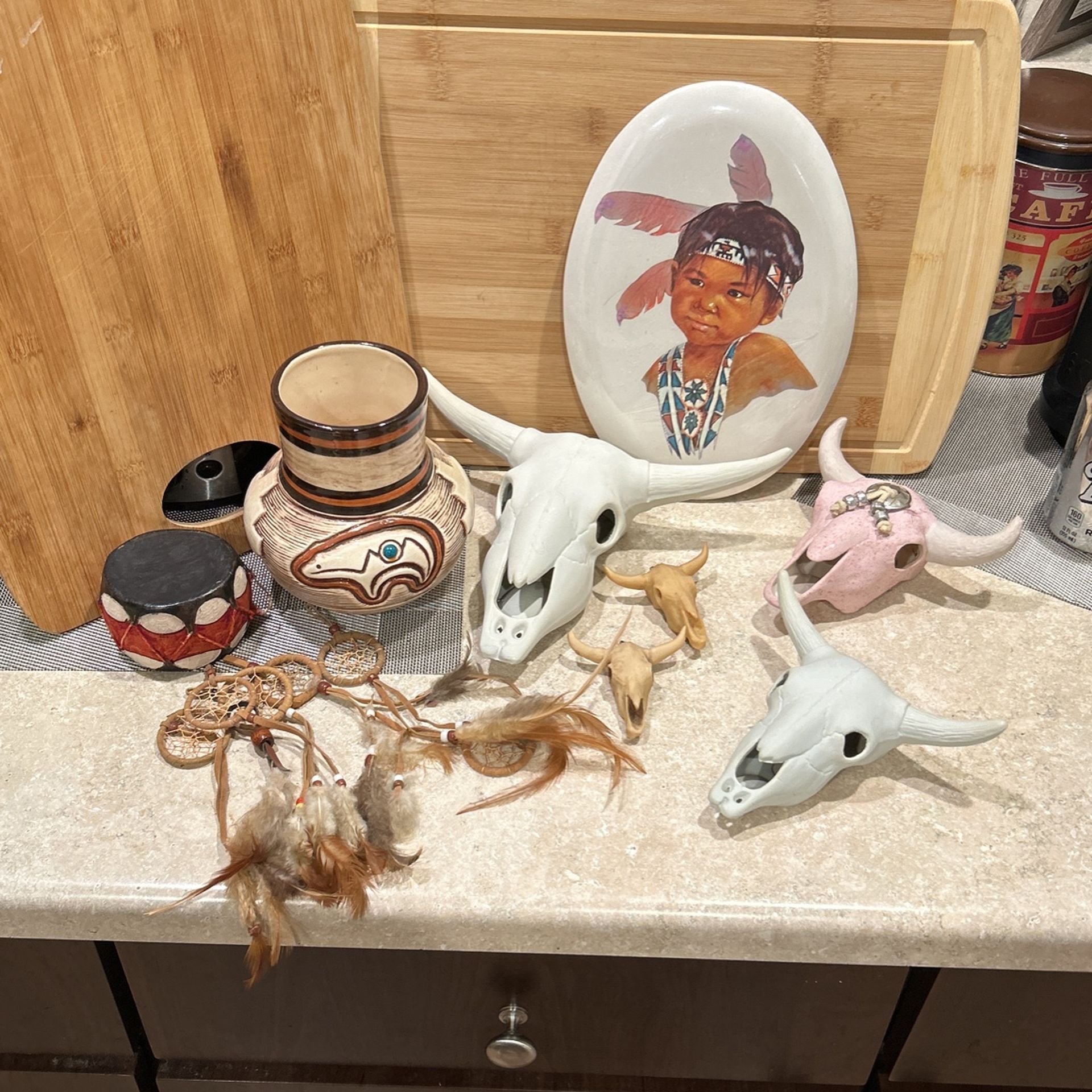 This is a bundle set of north western decor comes with little drum vase I believe Navajo little boy, picture, Navajo descent, or Cherokee skulls with dream. Weavers all sold as a bundle will not separate.