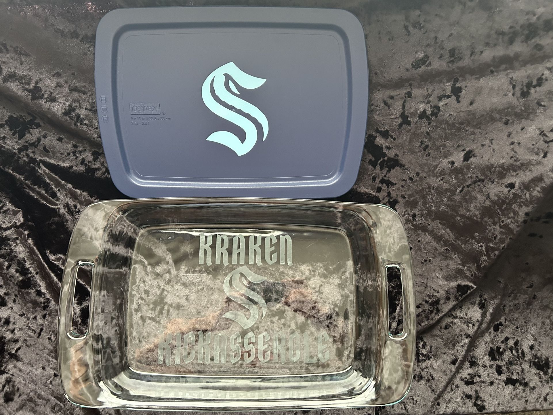 Seattle Kraken Kickasserole dish with lid. 9x13 Pyrex Grab and Go dish. Custom etched. I can do any team!
