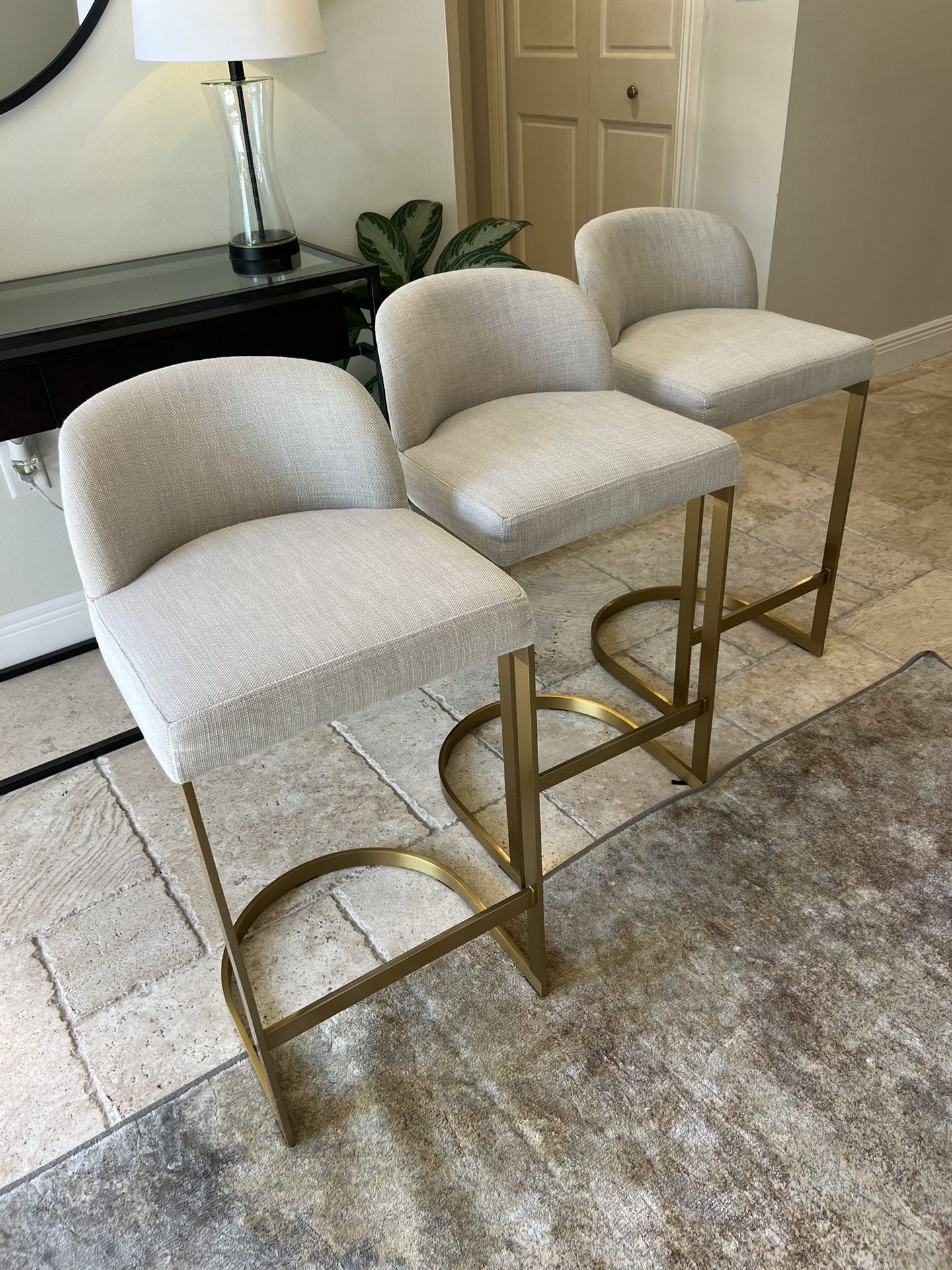 Three Restoration Hardware 1960s Rome fabric counter stool barstools. Burnished brass with off-white fabric.
