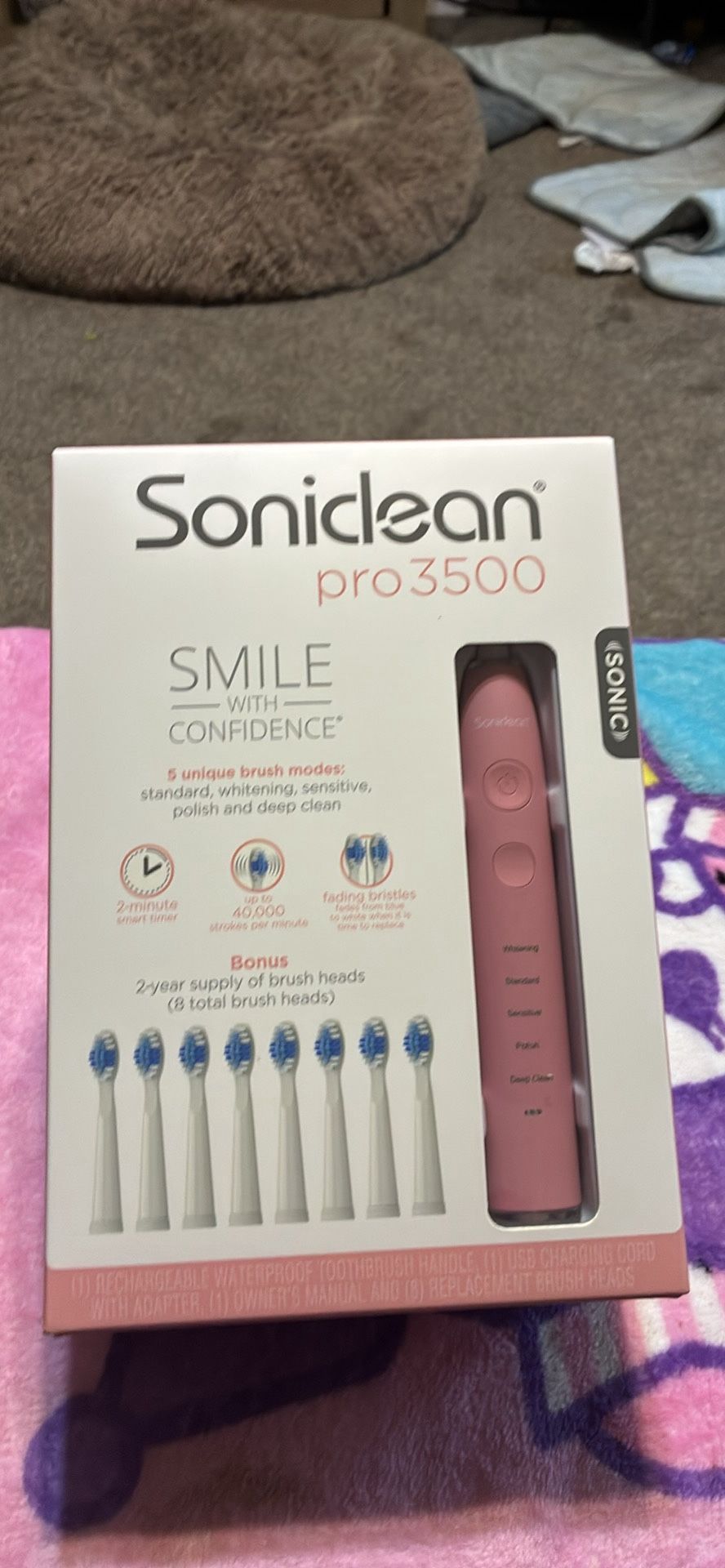 Still in box, never been used. The handle is pink. It comes with 8 replacement heads.