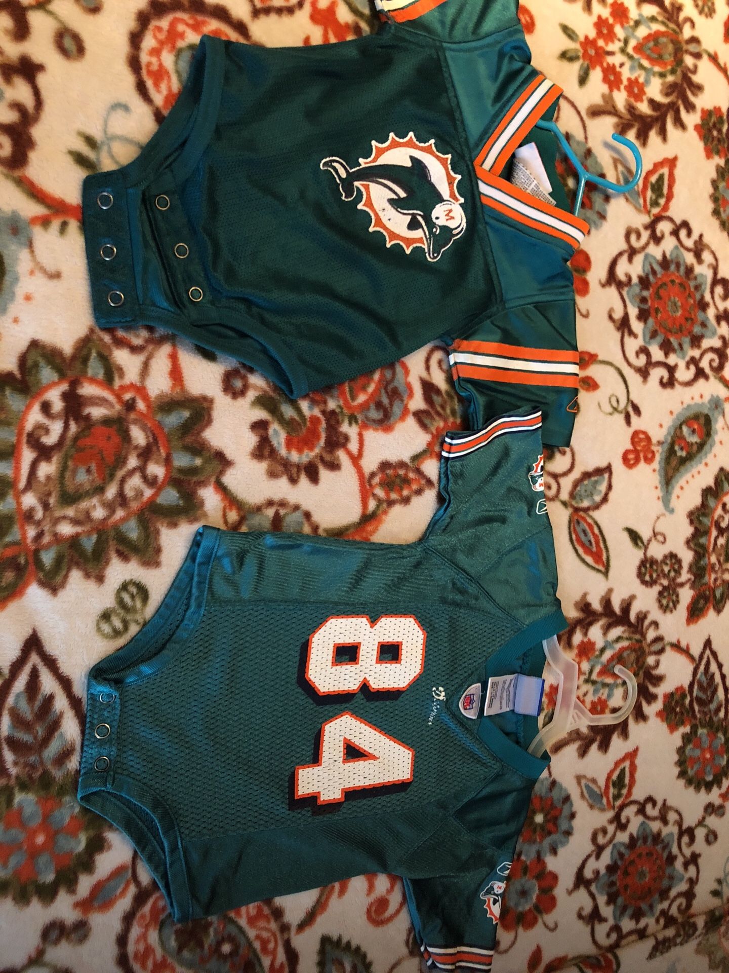 2 Miami dolphins jersey onesies .. made out of jersey material.. both size 12 months in excellent condition..$20 for both