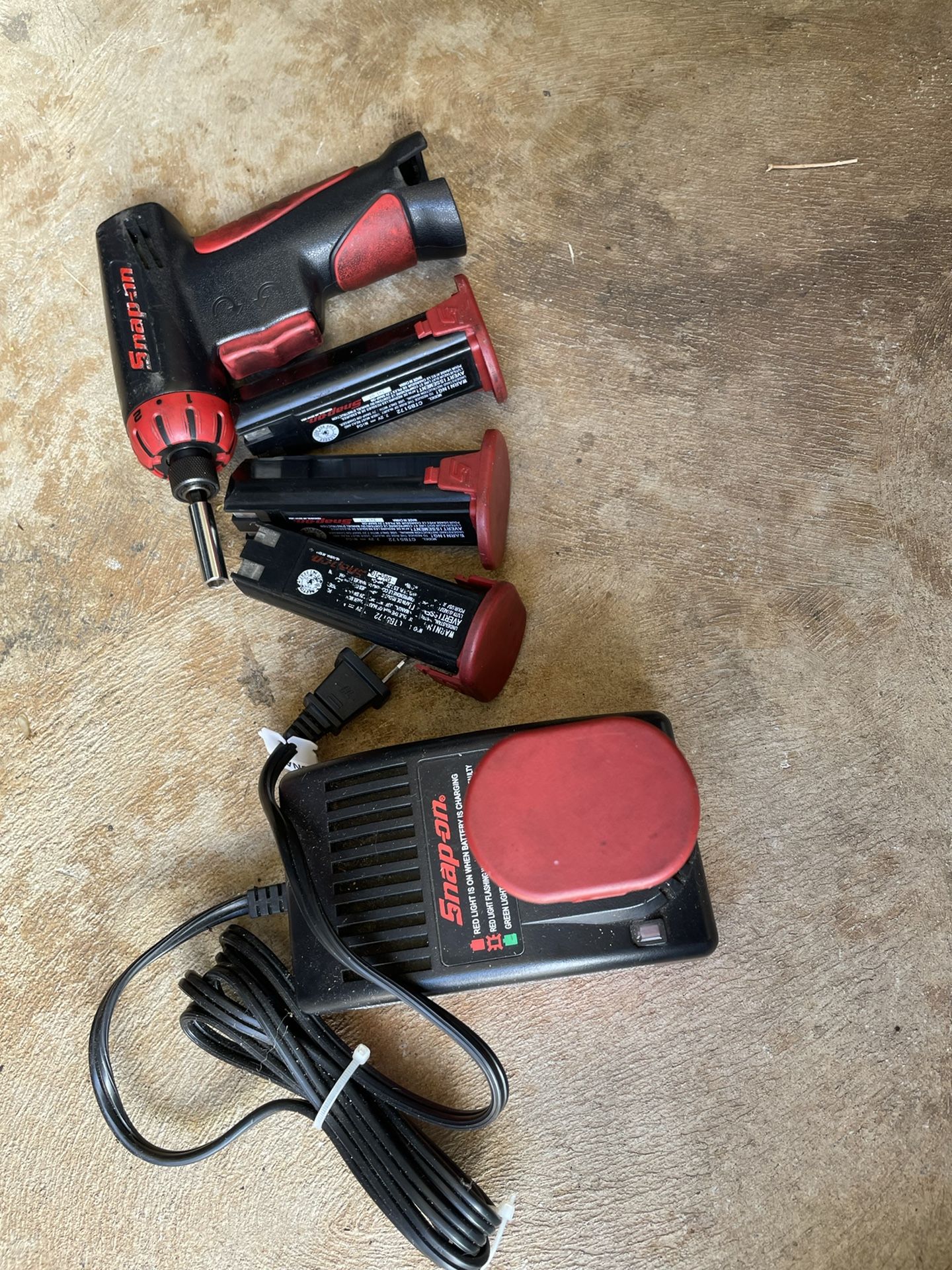 Snap on driver comes with 3 working batteries. Hex quick key lots of life left, super light weight for all day work projects. $100 firm.