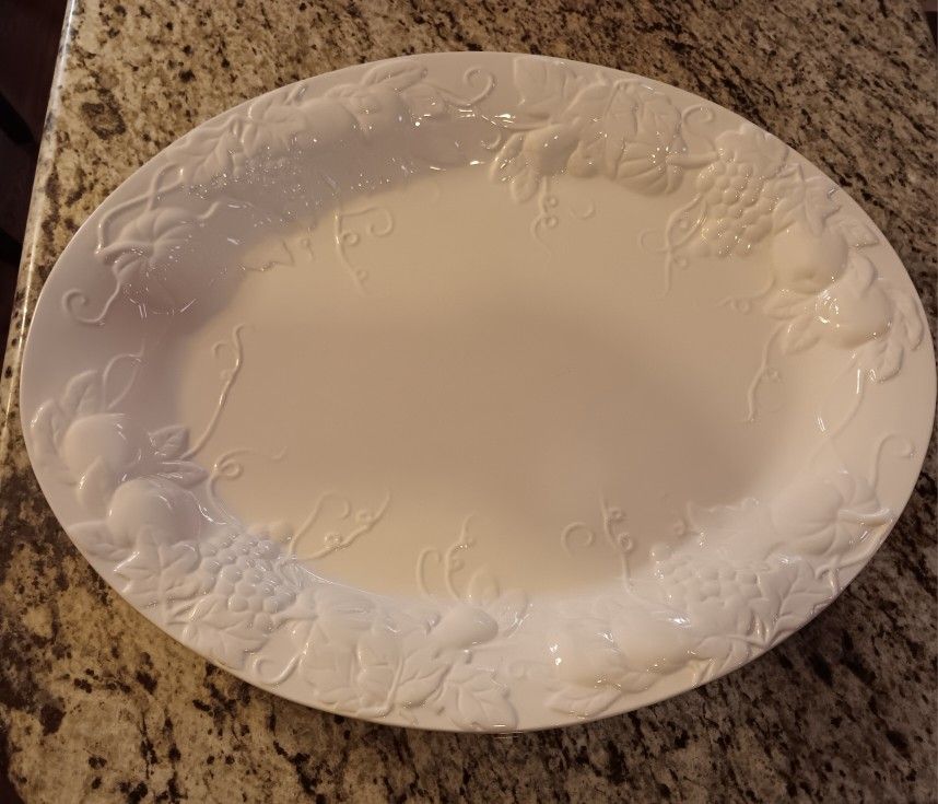 21x17 oval white embossed platter. Dishwasher and microwave safe. Made by Tabletops Gallery .