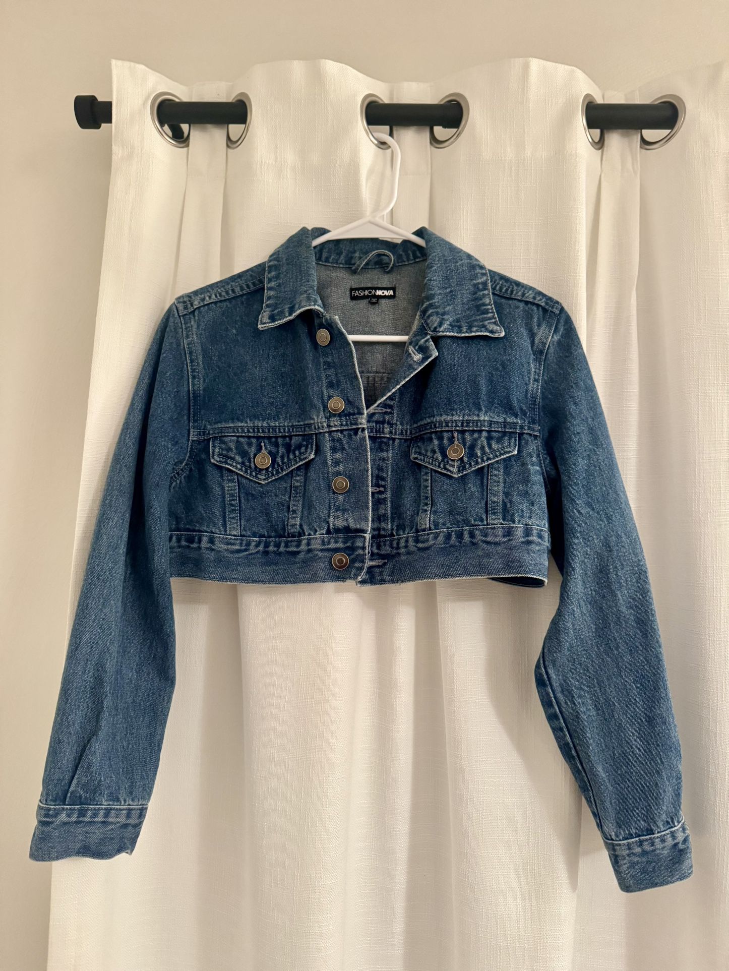 Fashion Nova, cropped jean jacket. Fitted and pairs great with a dress!