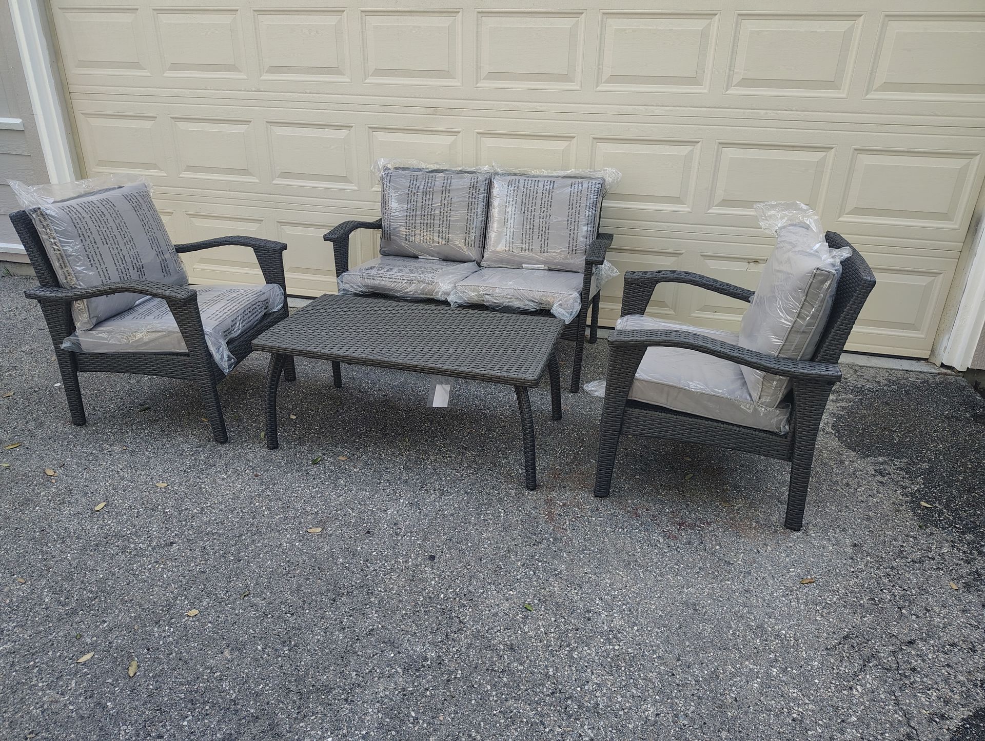 Outdoor patio 4 piece conversation set, wicker loveseat with chairs and coffee table loveseat measures 49 inches long 28 inches deep chairs 28 inches wide and 28 deep coffee table 41 1/2 long 21 1/2 deep and 16 inches tall $400 firm no less pickup