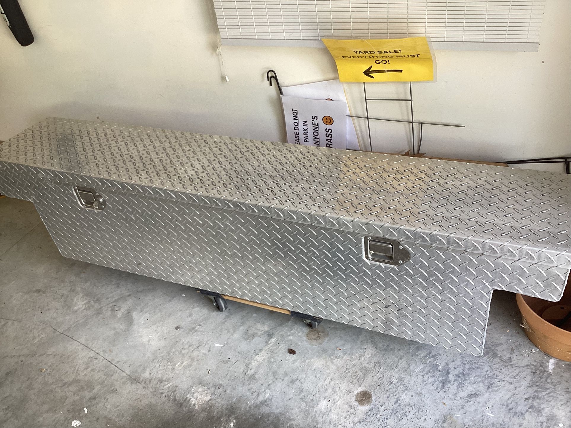 Slim truck bed toolbox. 58” wide inside bed. 69.5” wide that sits on sides of truck.