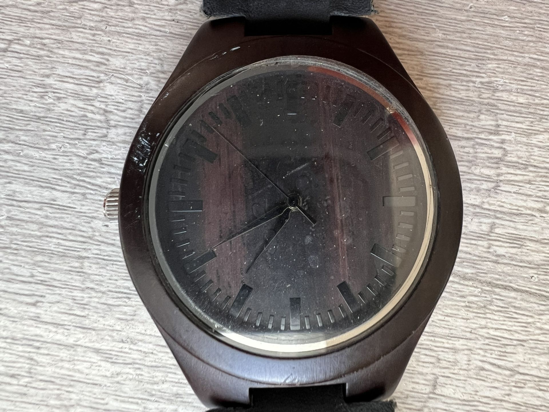 Selling a dark wood men's watch with a black leather band. • Details: Features a beautiful engraving on the back from Dad to Son. • Condition: Excellent. The protective film is still on the face. • Battery: Brand NEW battery installed. A great, thoughtful gift. Message me with any questions!