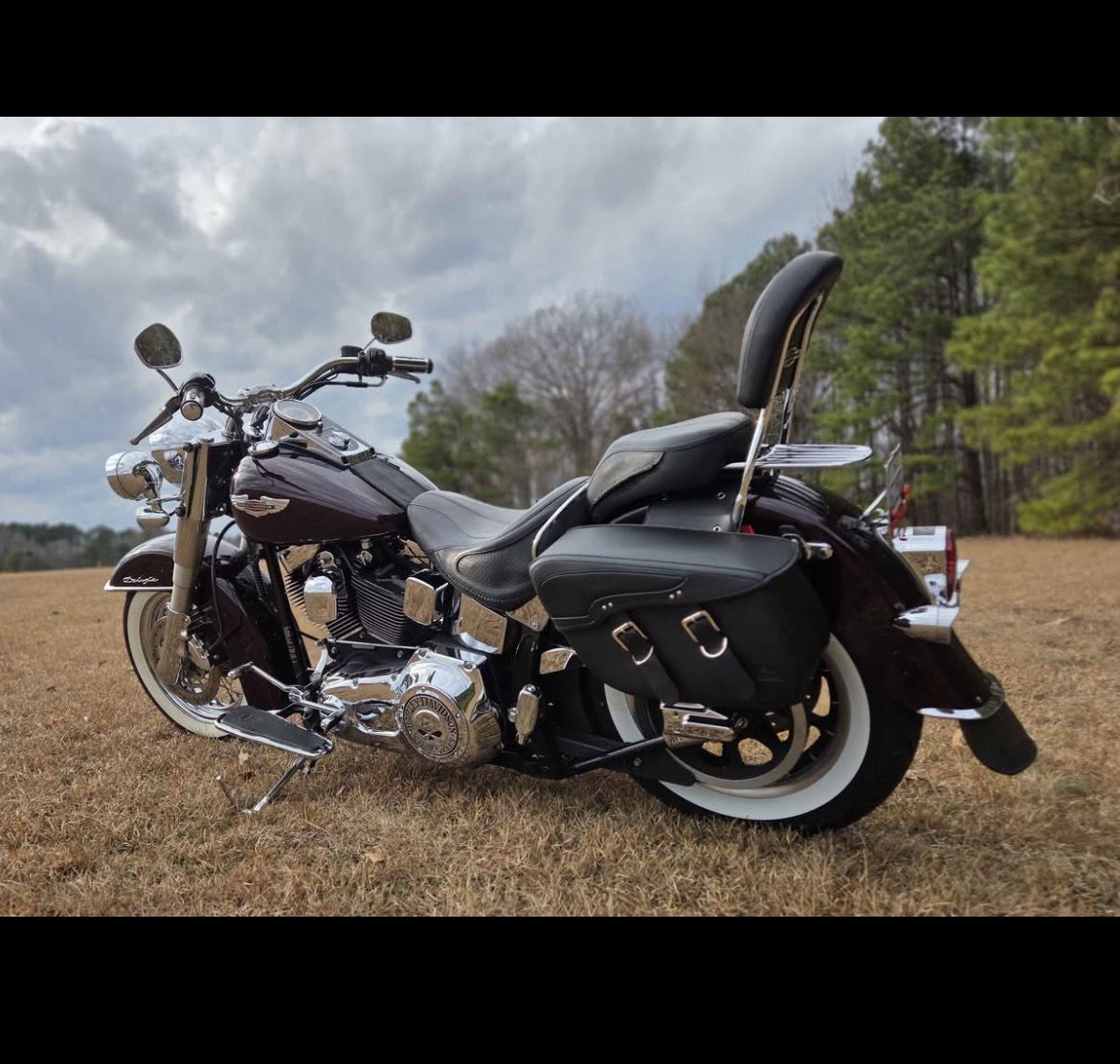 Really nice Softail Deluxe. Never wrecked, runs perfectly, brand new rear tire, Vance & Hines pipes sound awesome, saddlebags, backrest, luggage rack, windshield, several chrome upgrades, and more. Hard to get good pictures but the black cherry metallic color looks amazing in the sun. Very nice bike, very clean, ready to hop on and ride. You will not be disappointed. Low miles 16k , well maintained, title in hand