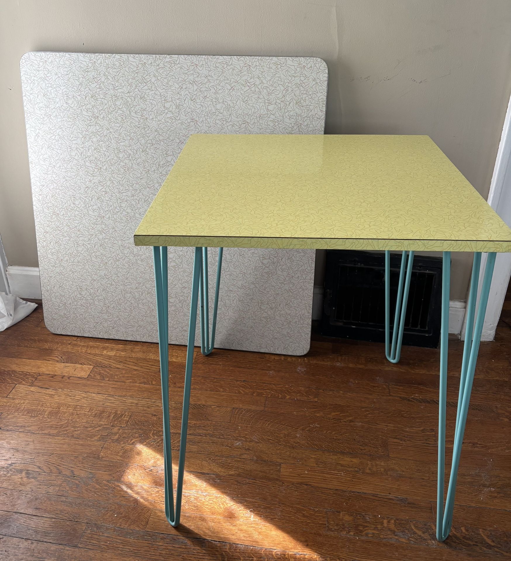 Small yellow table is approximately 24” x 24”. Legs are not original. Large tabletop (top only) is approximately 36” x 36” with metal trim. Both are in good condition for their age with some minor flaws. See photos $120 for both. Will divide- make offer