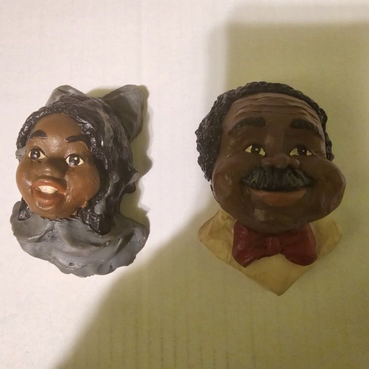 Shipping is available Add a touch of charm and character to your space with this delightful pair of hand-painted miniature busts. Crafted in the expressive folk art style reminiscent of Ike & Sandy Spillman’s Homestead Collection, these vintage-style figurines feature exaggerated facial details, vibrant clothing, and a warm, whimsical vibe. - 🎨 Material: Painted resin or clay - 📏 Size: Approx. 3" tall x 2.5–3" wide - 👩🎨 Style: Americana folk art with expressive features - 🧔🏽 Includes: One male bust with red bow tie and mustache, one female bust with long dark hair and gray garment - 🛠️ Condition: Gently pre-loved; please see all photos as they are part of the description - 🧺 Perfect for: Shelf decor, vintage collections, quirky gifts, or rustic displays Each piece tells a story—whether you're curating a cozy corner or gifting a smile, these busts bring personality to any setting.