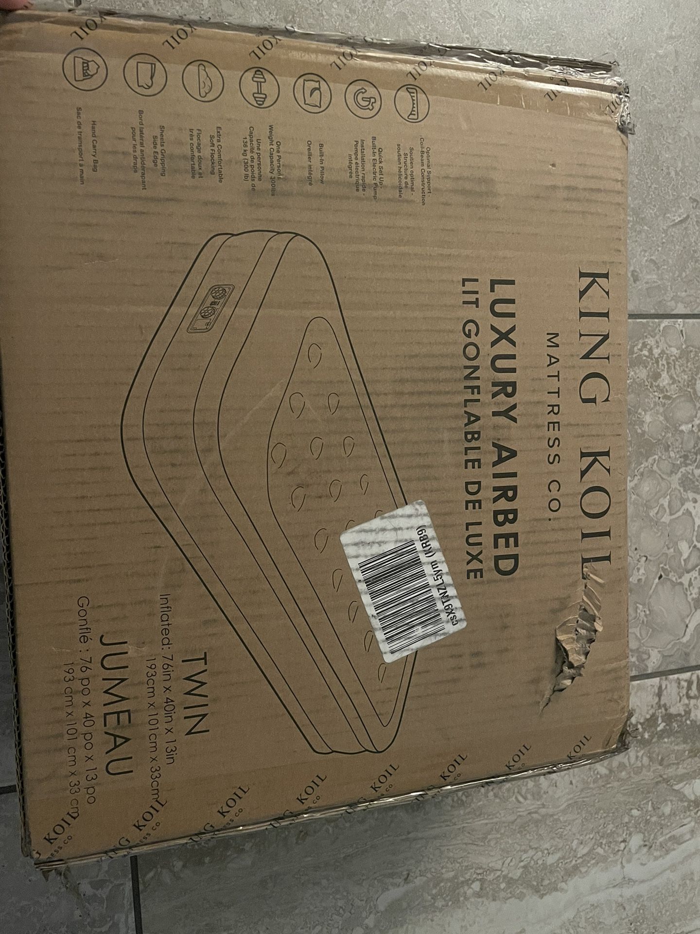 I have a brand new King Koil Luxury Twin Size Air Mattress with Built-in High Speed Pump for Camping, Home & Guests - Air Mattresses Airbed Inflatable Blow Up Mattress Waterproof ( black ) I am asking $95 About this item Flocked Top and Sides King Koil is LUXURY. Factory 1-year warranty provided by the manufacturer included in your purchase! - King Koil enhanced twin airbed technology with a - soft flocking layer and a built-in pillow. Built for maximum comfort - we stand behind our quality & warranty! warranty details in packaging and with airbed purchase. Extra thick waterproof comfort quilt top with extra spinal support - firm mattress provides good sleeping posture - sueded top keeps bedding in place. Twin sized with coil-beam construction and a built-in 120v / 210w ac pump - inflated dimensions: 76" x 40" x 13" should you accidentally puncture or tear your air mattress, all King Koil air mattresses include patch kits. Easy to use plug in internal pump allows fast & easy inflation / deflation. The King Koil mattress reaches full inflation in 90 seconds. The King Koil air mattress is designed for in-home use and is perfect for overnight guests, friends or relatives, and camping trips. Remember, although it holds air extremely well, you can always click the pump on for a few seconds to inflate or deflate to your desired comfort level. King Koil is the only manufacturer that is endorsed by the international chiropractors association to help promote proper spinal alignment and a healthier night's sleep. Product information Product Dimensions 76 x 40 x 13 inches Item Weight 13.8 pounds Manufacturer King Koil ASIN B0957T9B41 Item model number 29311 Customer Reviews 4.4 out of 5 stars 42,549Reviews Best Sellers Rank #265 in Sports & Outdoors (See Top 100 in Sports & Outdoors) #4 in Camping Air Mattresses #6 in Air Mattresses Fabric Type Flocked Top and Sides Maximum recommended load 159 Kilograms Assembly required No Warranty Description King koil luxury air mattresses come with a customer obsessed 1-year manufacturer warranty. Batteries required No Material Durable Top & Side Flocking Specific Uses For Product Sleeping Included Components High Speed Built in Dual Air Pump - Blows Up Bed In 60 Seconds Target Audience Kid, Adult Item Weight 13.8 Pounds Capacity 350 Pounds Number of Items 1 Weight Limit 350 Pounds Item Firmness Description Extra Plush Water Resistance Level Water Resistant Item Thickness 13 Inches