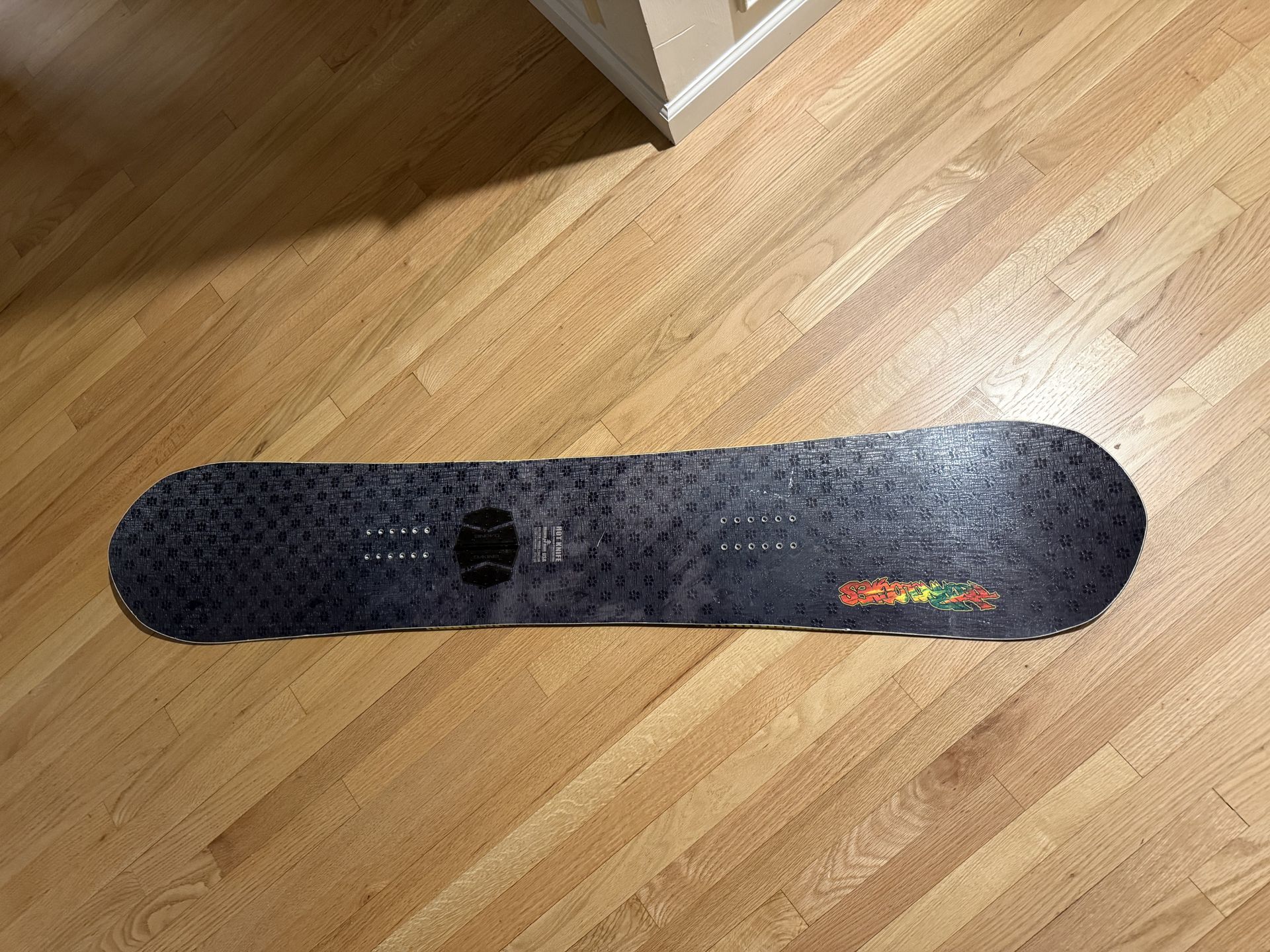 Lib Tech 157 Hot Knife 157 snowboard in great shape. A few scratches but nothing close to core. With Da Kine stomp pad. The Lib Tech Hot Knife is a very appropriate name for the kind of ride it provides. This has a very technical camber feel to it that isn't great if you get off your game and have to skid turns and doesn't float well in powder. That being said, it's super fun to make good turns with and has great pop out of the tip and tail. The Lib Tech Hot Knife has the aggressive camber feel of the C3 Jamie Lynn Classic and the aggressive Twin feel of the T.Rice but still has it’s own unique feel to it. If you are a normal size boot like a size 8-10 US the Hot Knife will be a much better call than the T.Rice. If you like the idea of the Jamie Lynn Classic but want a twin this is the better choice as well. This C3 hybrid camber is unique to the hybrid camber design world. There is a mini rocker that doesn’t touch all the way down between the feet and then camber that goes to the same point that normal camber does at the tip/tail. It’s basically the opposite of C2 technology. On Snow Feel: The Hot Knife is all about high-speed assaults on the groomers regular or switch but it’s also a great aggressive park ride too for pipe and jumps. This sums up aggressive all-mountain freestyle. Camber boards like the Hot Knife are fun to straight line or flat base. They track well without the loose feeling hybrid rocker shapes offer but come with consequences. This hot knife is one of those aggressive technical boards that like’s to spring from an ollie or a carve. It adds a new twist to the old school stoke you can get from aggressive camber twin riding. The 156 gave us a lot of board for the size. Normally a board like this would be locked in with this kind of flex and camber but that little bump between the feet makes the board feel less catchy than it should be. One footing and flat basing are easy but there is a consequence to the ride if you aren’t on your game and have to skid a turn or two. It’s not easy for skidded turns.