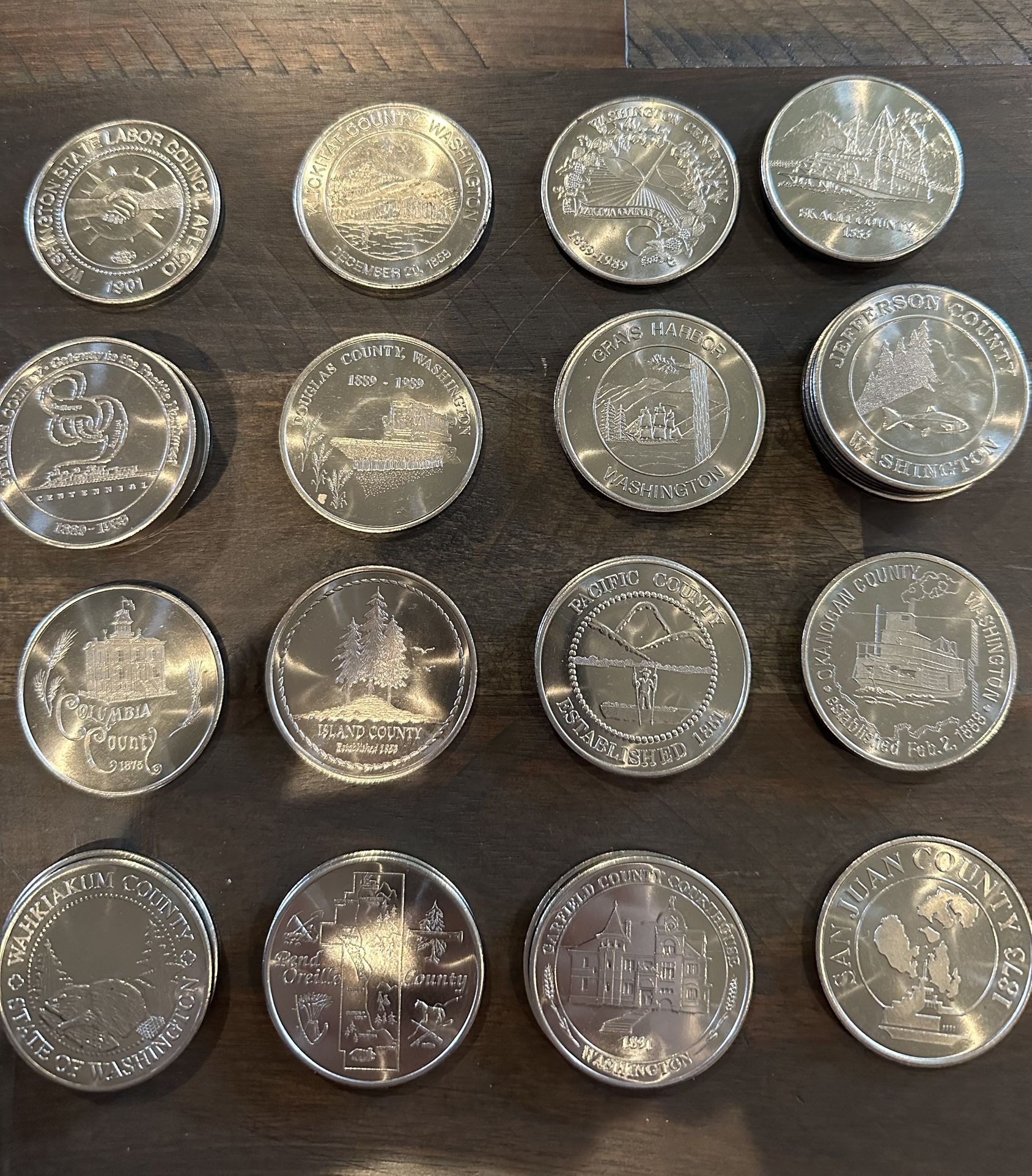 33 coins total Good condition $5 a piece or $150 for all Locations: San Juan Island County Garfield County Courthouse (2) Pend Oreille (2) Wahkiakum County (3) Columbia County Island County Pacific County (2) Okanogan County (2) Stevens County (6) Douglas County Grays Harbor (2) Jefferson County (5) Washington State Labor Council AFL-CIO Klickitat County Washington Centennial Skagit County (2)