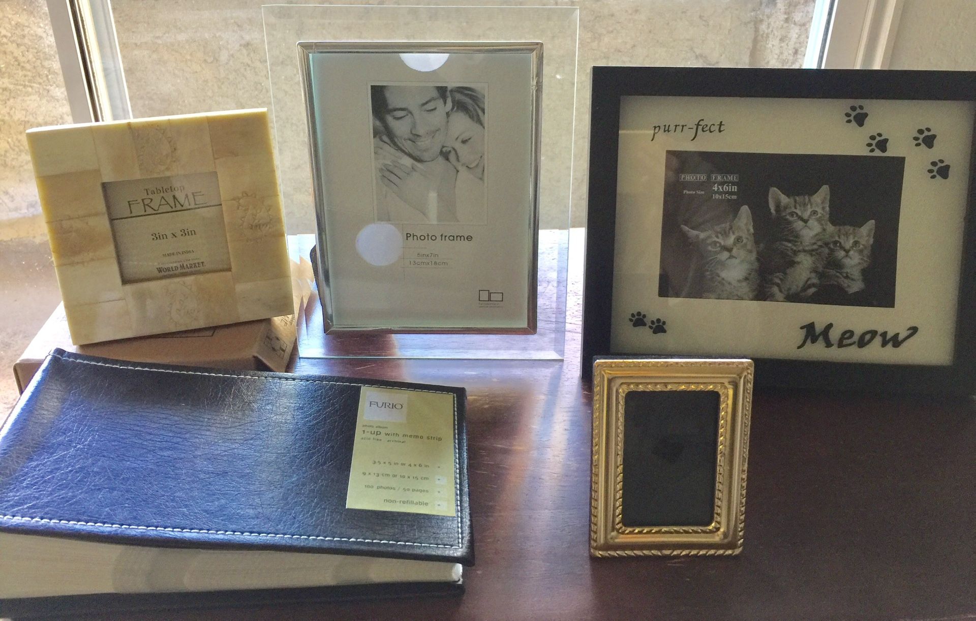 Black cat frame with meow and purr-fect wording on glass. Backing of the board on one corner slight damaged still functions $5 New 5x7 glass picture frame $8 New 8x10 inch decorative silver frame $10 (comes in original box New 3x3 World Market carved frame with box $8 New Baby photo album holds 100 of 4x6 inch picutures $5 New Photo album holds 100 photos for 3.5x5 or 4x6 size $10 New in Box never used no scratches in perfect condition Partylite hurricane cylinder glass Candle Holder $20 New Bath & Body Works scented Red Delicious candle in 7.5 oz jar and lid - no scratch no cracks $5 Used Large picture frame with gold pattern trim picture size 12inch wide x 19 inch tall. Overall frame size 21inch wide x 25 inch tall. $30