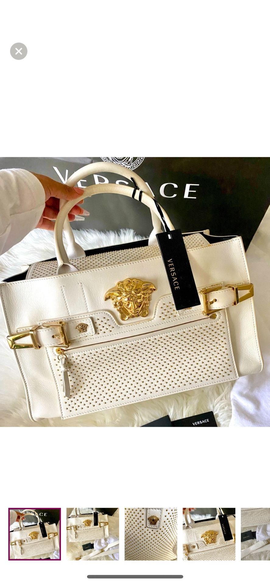 Beautiful Versace Gold and Off white Medusa studded Bag Leather Rock Gotti Edge Bomb New with Tag Cards Dust Bag Included , 2015 Versace Fall Winter NWT never used New Versace Palazzo Large white Studded Leather Shoulder Bag Handbag Limited Edition Bag ! Superb to the one Selena and Gaga are carrying