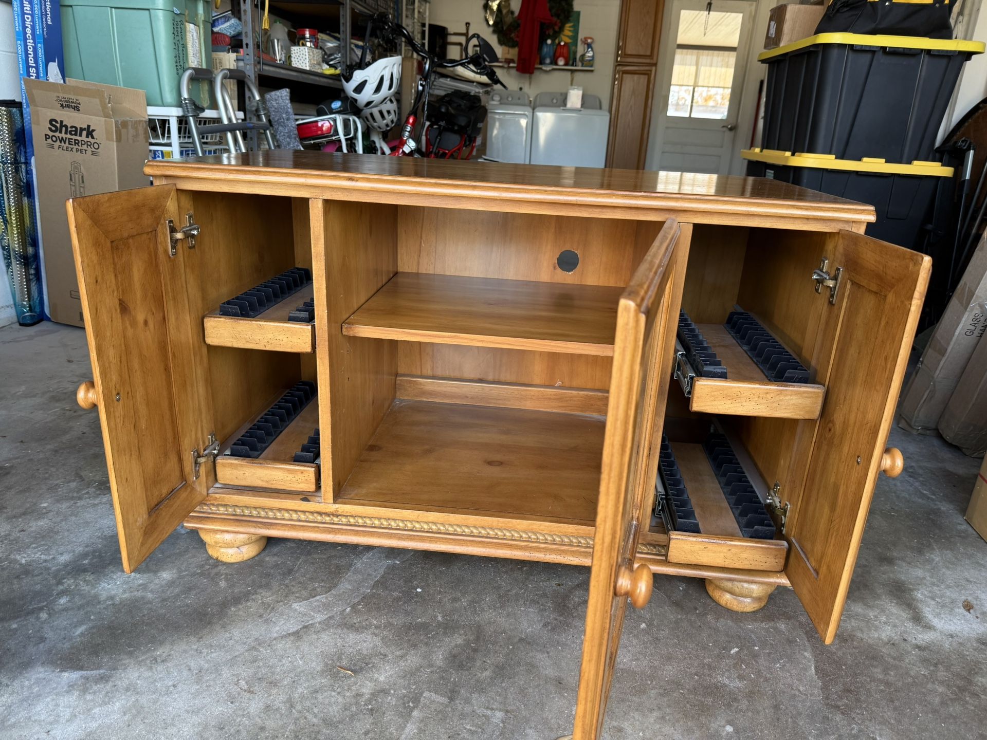 Solid wood with 4 pullout shelves on ends and 1 adjustable shelf behind glass door. Measures 40” wide by 20” deep and 26” tall. Good shape.