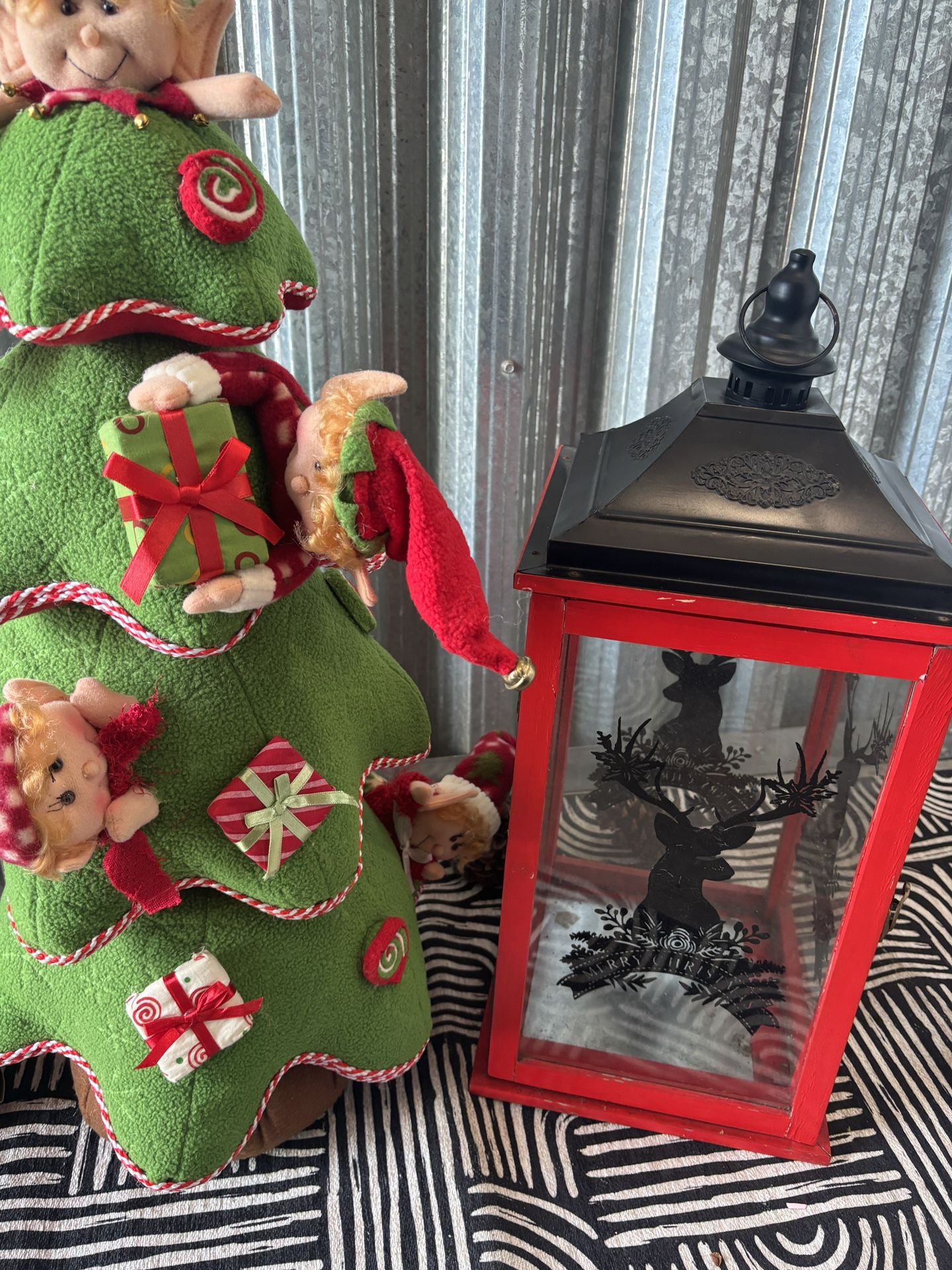 $15 Red and black Christmas lantern. With deer design. Used condition. Can place LED candle inside $18. Plush elf christmas tree each piece of tree is removable