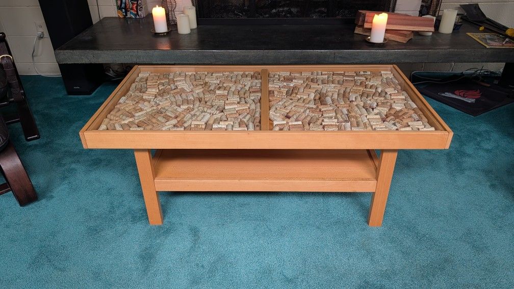 Perfectly sized coffee table with storage shelf. Scale would suit small apartment, but quality could work with larger space. Unique display area under glass. Wine corks in photos optional. Dimensions 46.5"L x 24"W x 17.5"H