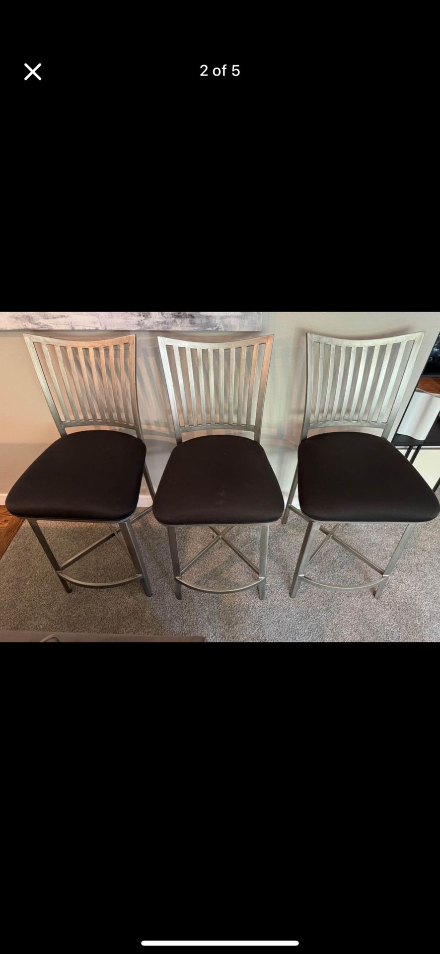 High quality, sturdy stools that swivel for ease of use. Brushed metal with black seats. Fabric has usual wear, you could re-cover or enjoy as is. Comes with dark brown faux leather seat covers. Seats are~27” from the floor. Priced to sell. Easy porch pick up in Kirkland near the Boys and Girls Club.