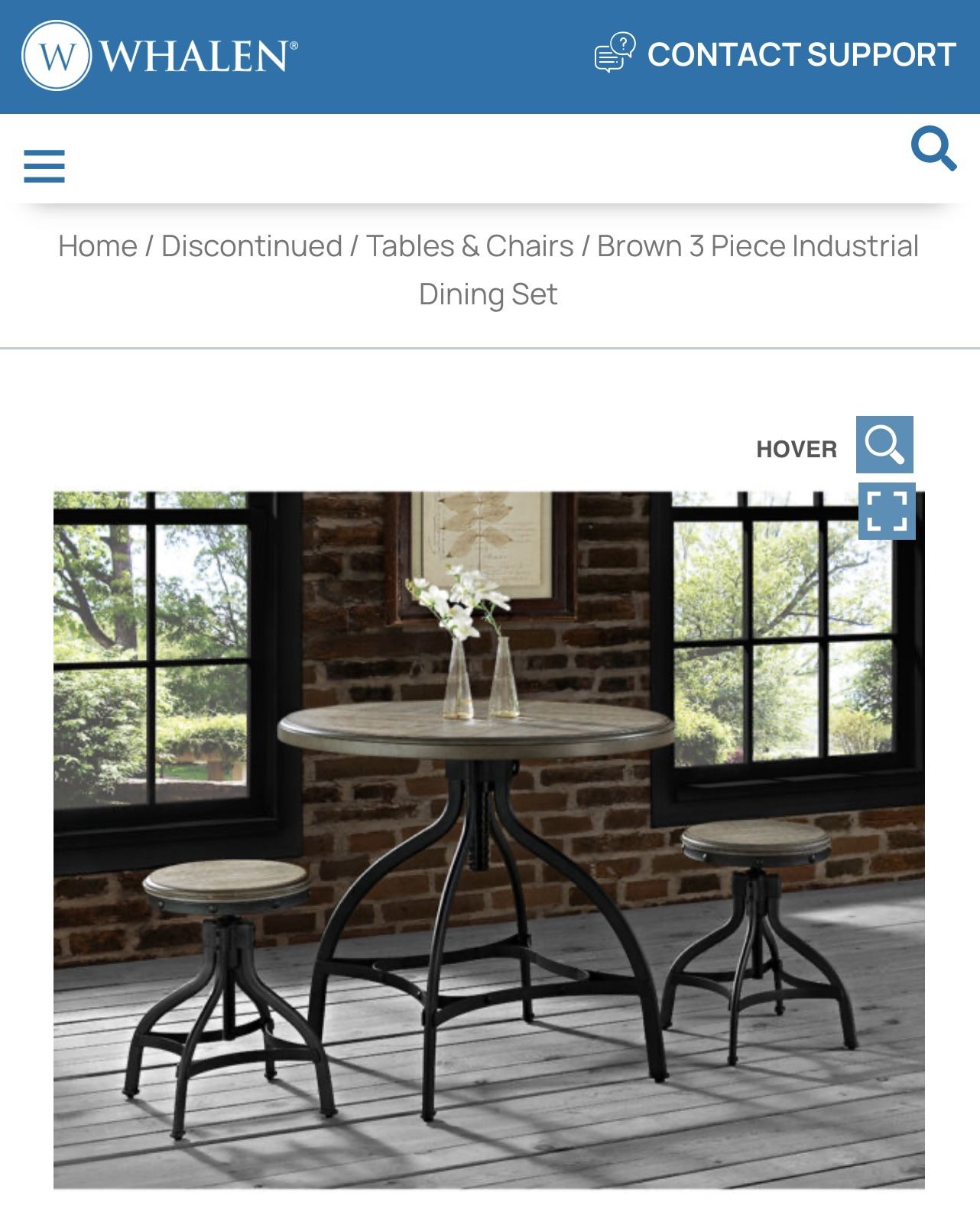 Set includes dining table and two adjustable stools Adjustable table top and stools Distressed brown finish table and stool tops Dark industrial finished steel base on Table and stools Steel base with wood top Modern industrial design Color: Brown and Black Size: 36in Style: N/A Dimensions: Table: 36in W x 36in D x 30-36in H;Stool: 14.25in W x 14.25in D x 19.75-25.25in H Used but in excellent condition. FCFS. No holds, delivery not available. Industrial, bar set, man cave, modern, wood.