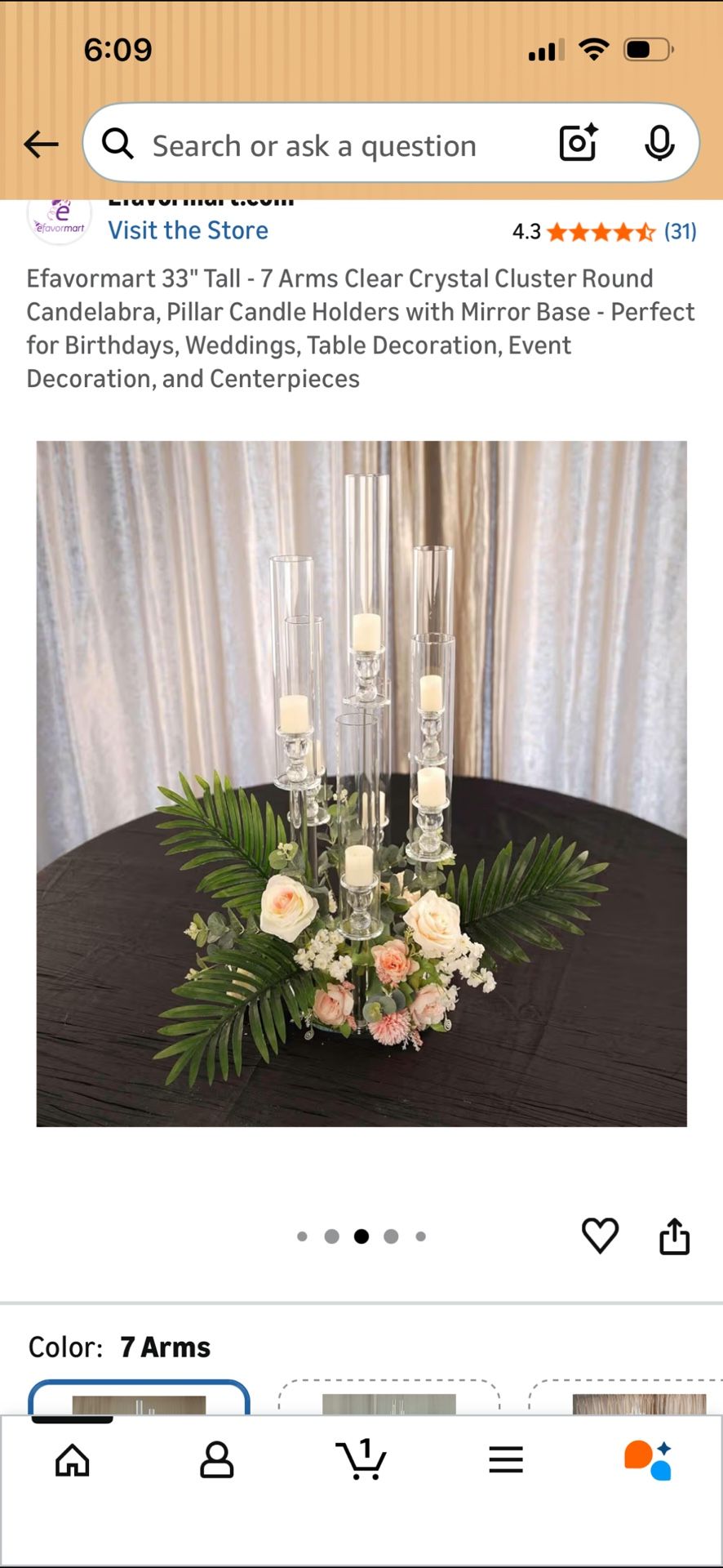 7 Arms Clear Crystal Cluster Round Candelabra. It’s 33 inches tall! (Please don't waste my time!!) Please be patient with me I sell these stuff for my dad who sells party supplies!
