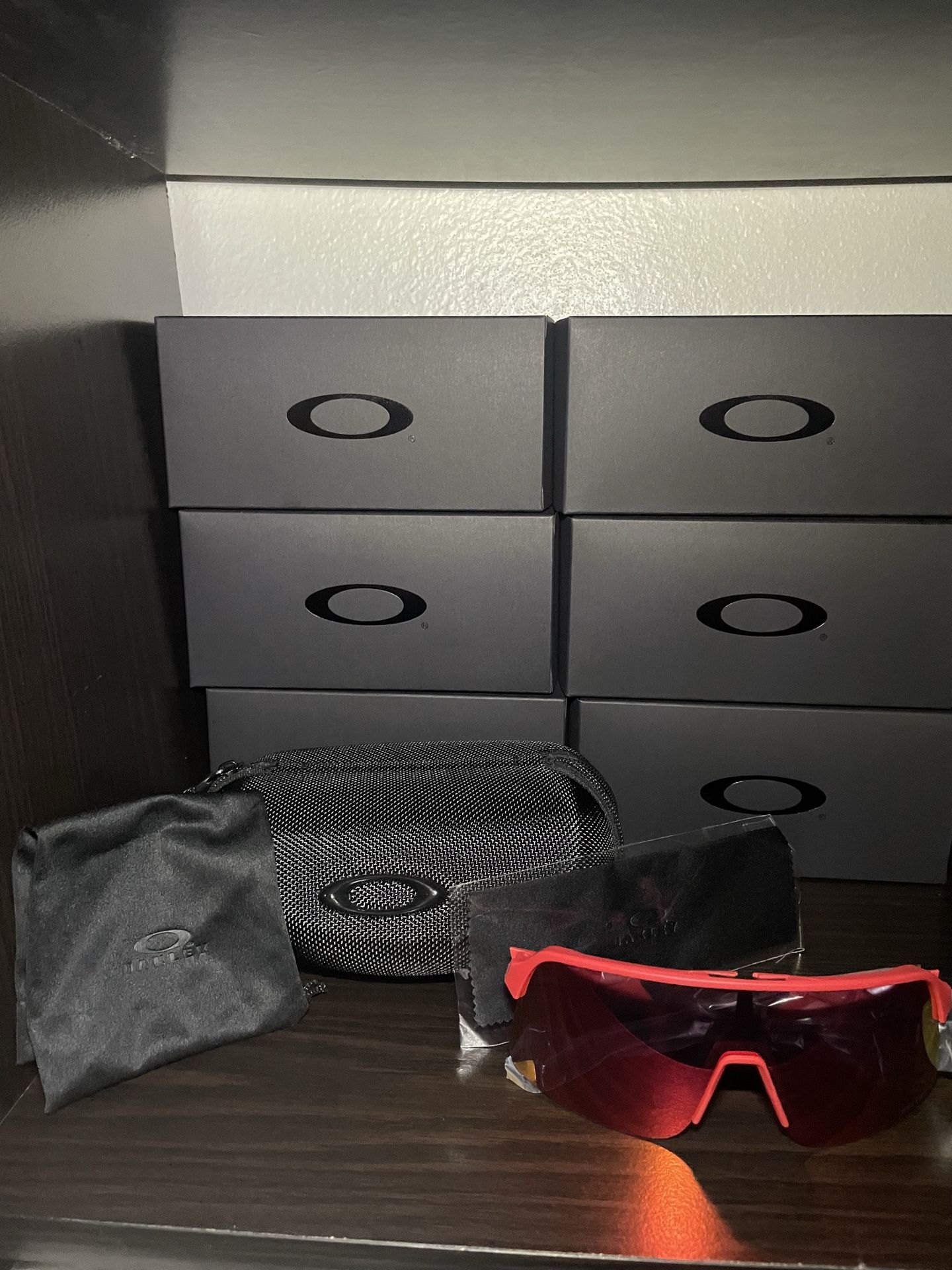 I have these reflective Oakley sun glasses, they come with carrying case, box, cleaning cloth, and small carrying bag, don’t get the sun in your eyes this summer. Dm for more information