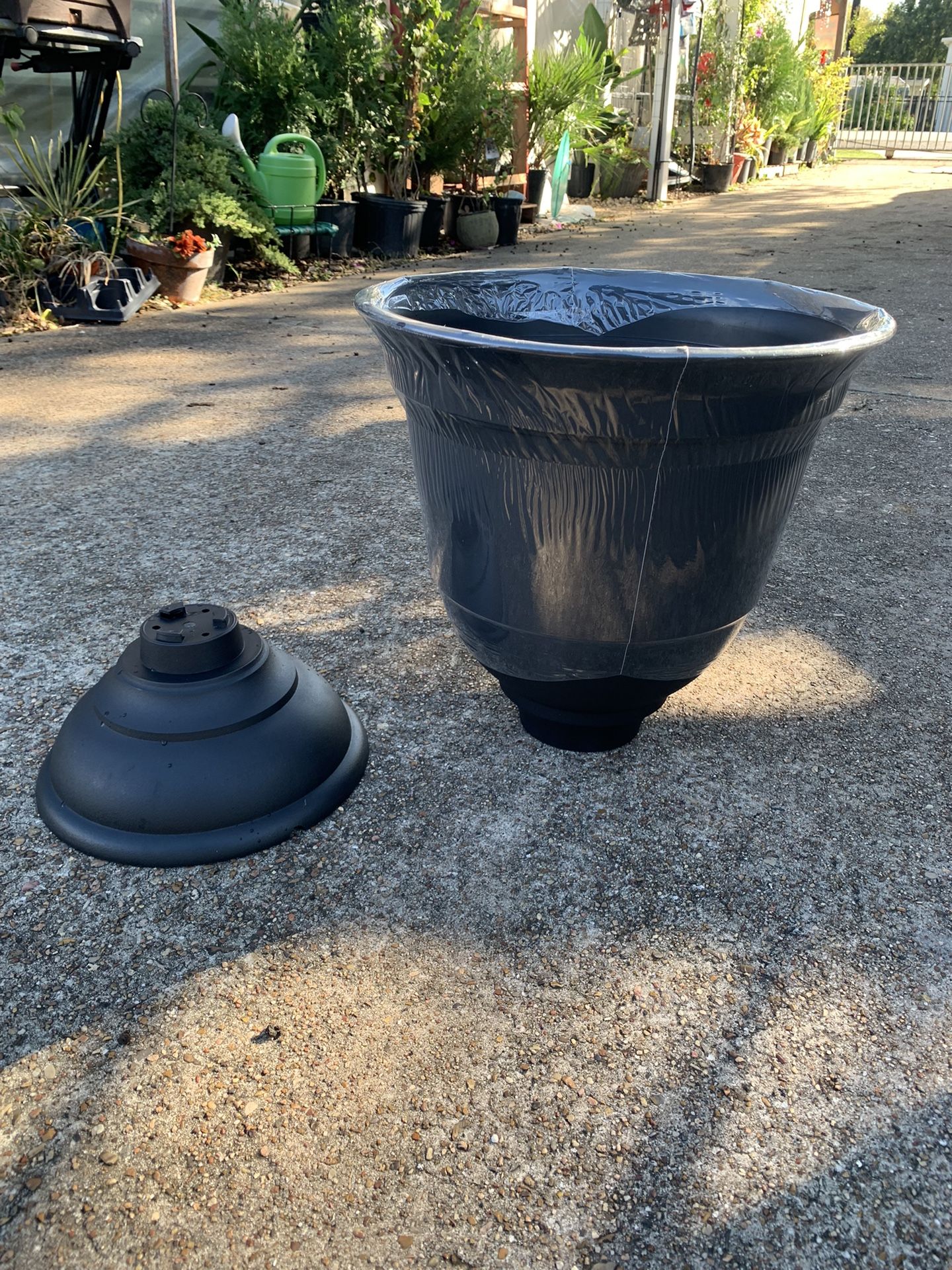 Beautiful planter Round black planter Plastic material Light weight Weather resistant Indoor or outdoor Dimension 16 inches tall 12 inches wide 8 inches base 3 drainage holes Only 25