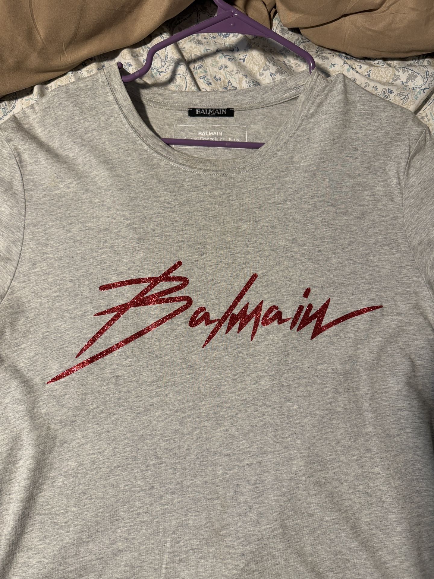 Grey balmain tee with red glitter logo. Size XL but fits like a L Worn 2x. Comes with receipt and bag. Purchased from Neiman Marcus.