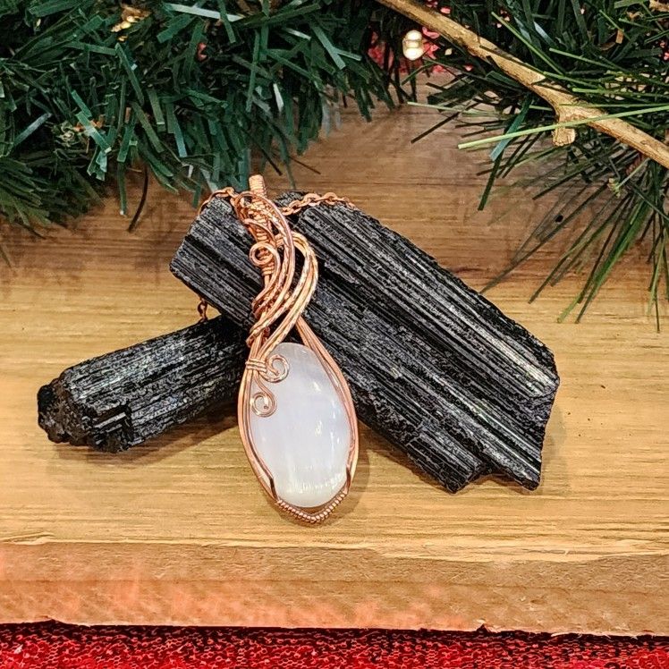 Selenite Satin Spar Gemstone Pendant Wire Wrapped In Copper