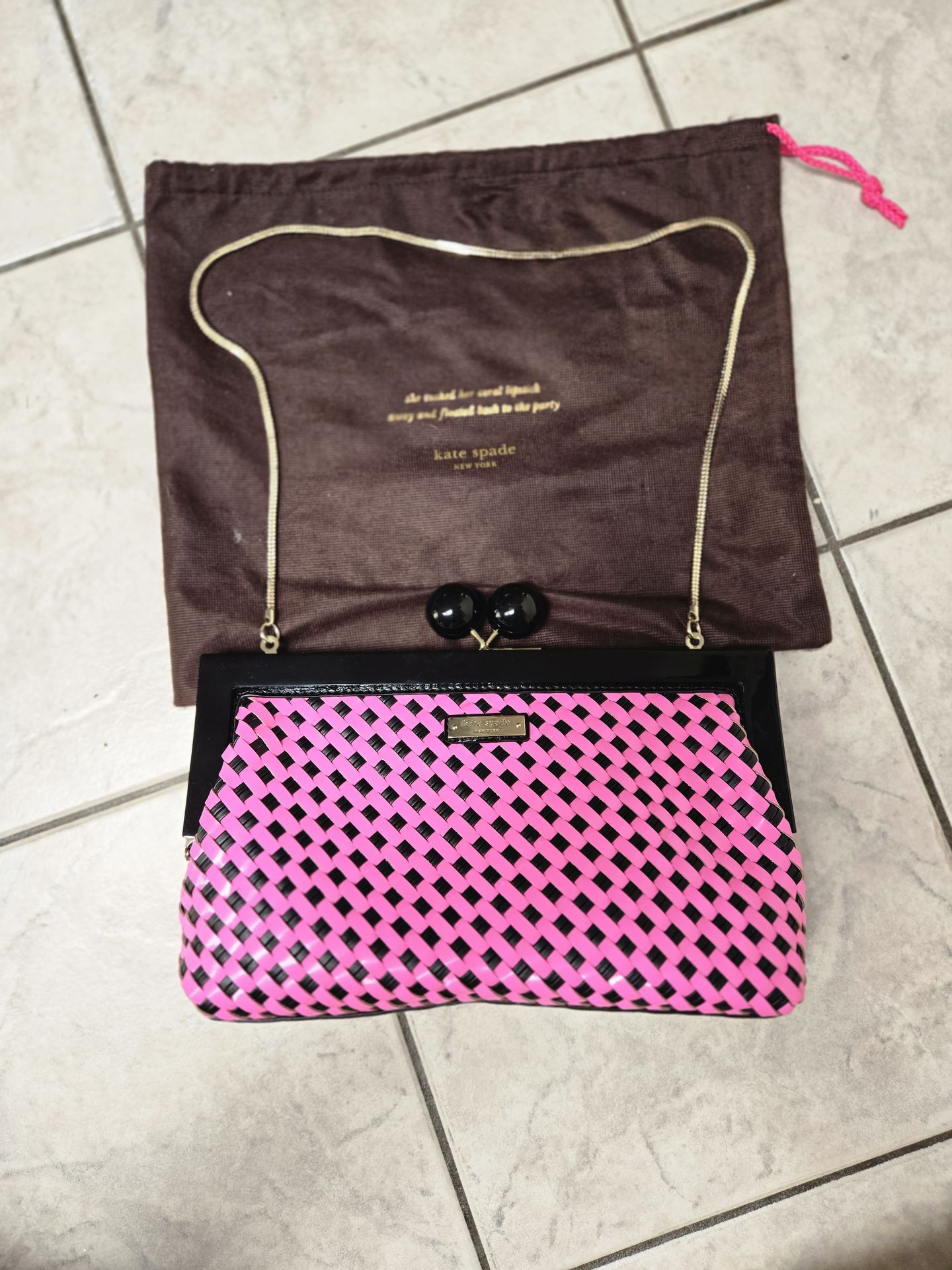 Brand new Kate Spade pink and black woven clutch handbag with gold chain and black ball clasp. Has a black interior with a zipper pocket and card slots. Comes with brown storage bag.