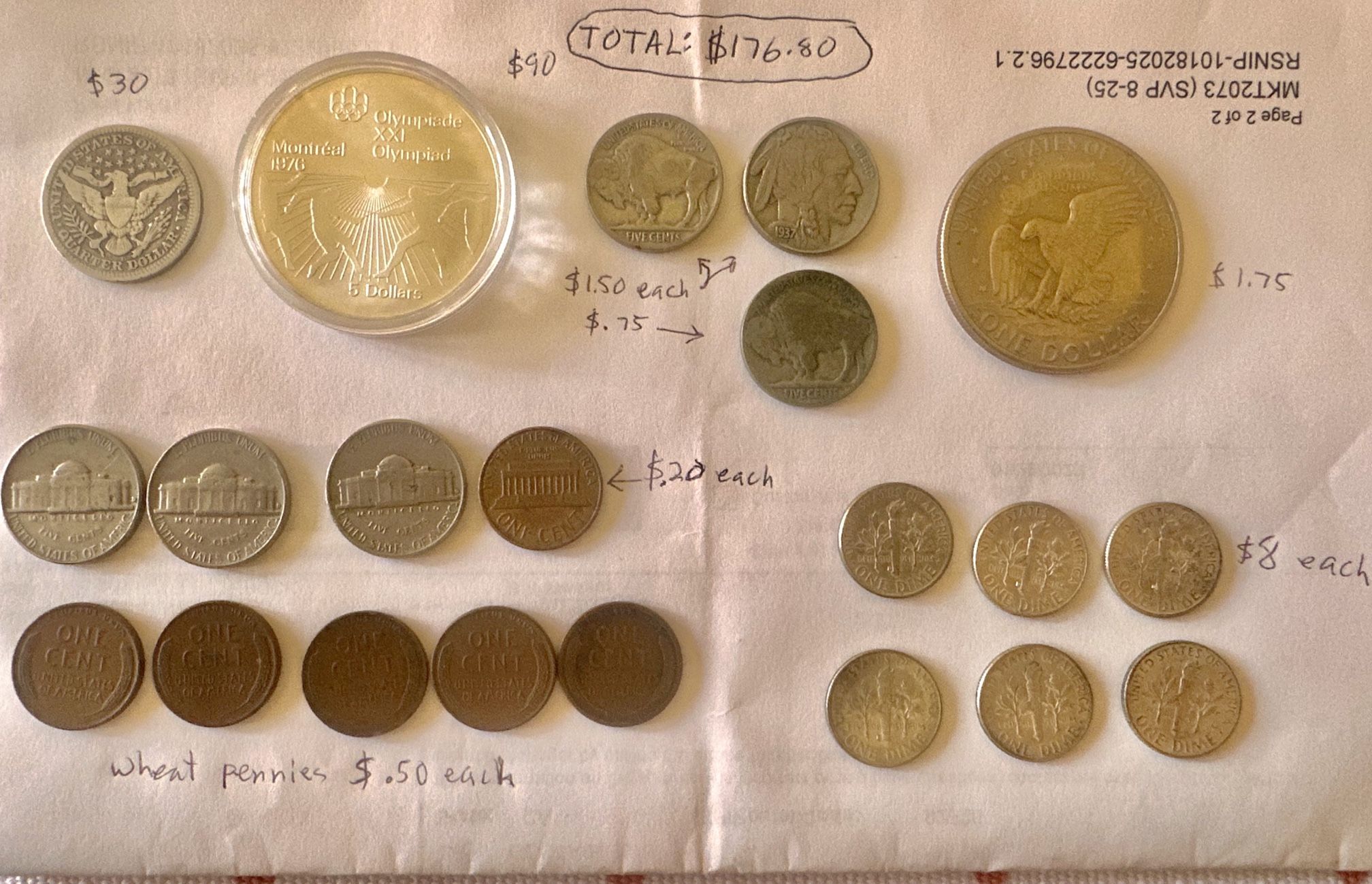 Silver Coins, Buffalo Nickels & Wheat Pennies Prices listed in photo. Silver prices have been volatile for the last few days, but I am hoping for at least $150 for everything.