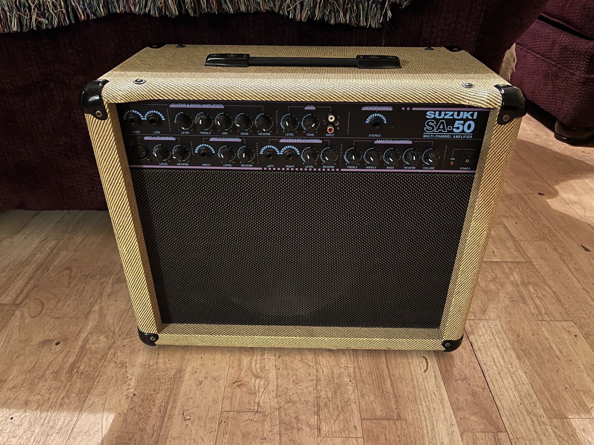 Suzuki SA-50 guitar, bass, keyboard and microphone combo amplifier. In great shape. No major damage, but some minor signs of use as seen. Electronics work as they should. Great sounding amp— and you can plug 4 different instruments into it. Local pickup in Ocoee, FL.
