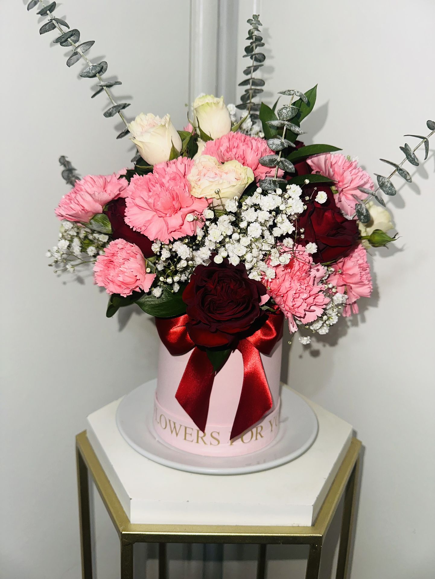 Pink box with mi flowers $80 Black box with red roses $130