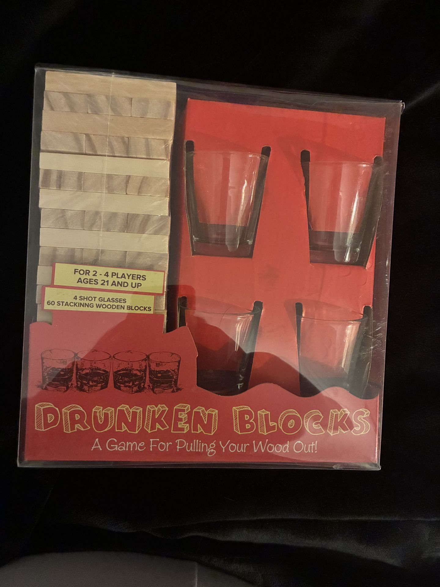 Adult drinking game . Never opened . Comes with jenga blocks with prompts on them and 4 shot glasses.